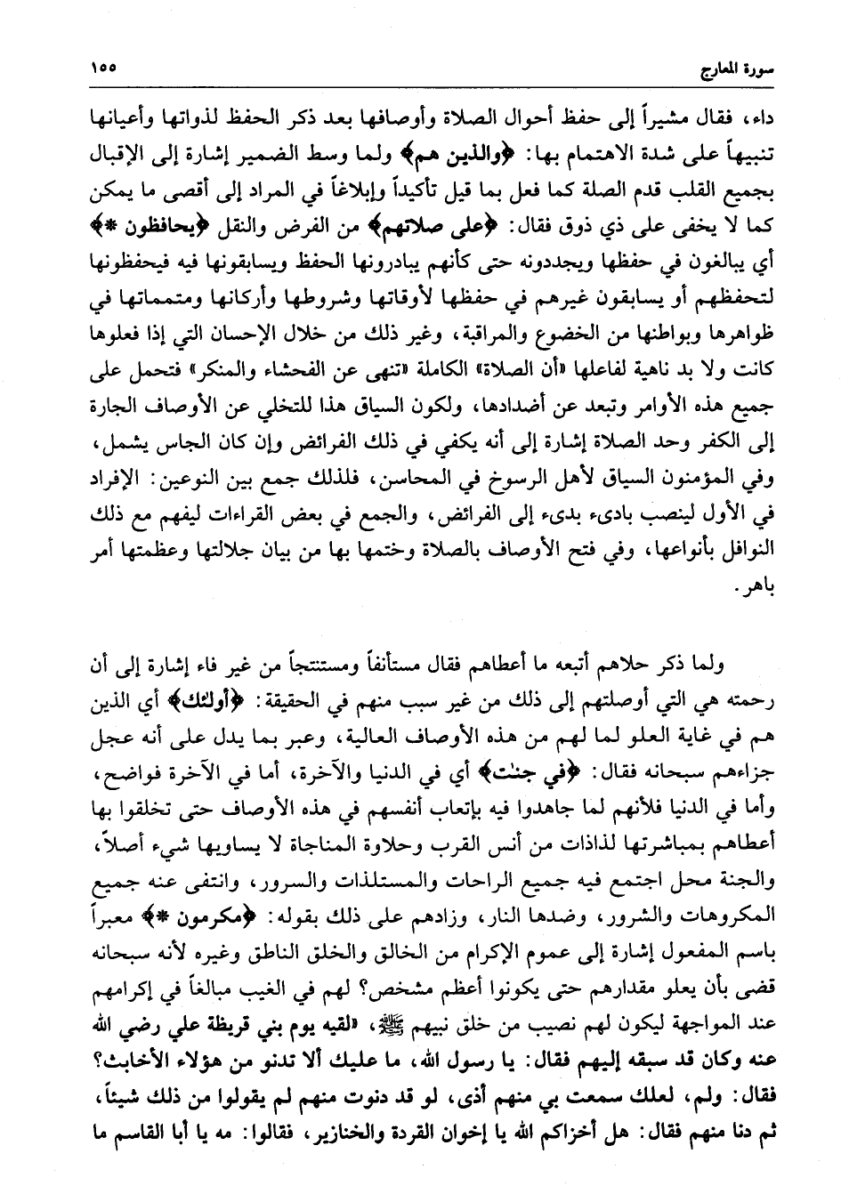 داء ، فقال مشيراً إلى حفظ أحوال الصلاة وأوصافها بعد ذكر الحفظ لذواتها وأعيانها تنبيهاً على شدة الاهتمام بها : ( والذين هم ( ولما وسط الضمير إشارة إلى الإقبال بجميع القلب قدم الصلة كا فعل بما قيل تأكيداً وإبلاغاً في المراد إلى أقصى ما يمكن كما لا يخفى على ذي ضوق فقال : ( على صلاتهم ( من الفرض والنقل ) يحافظون ) أي يبالغون في حفظها ويجددونه حتى كأنهم يبادرونها الحفظ ويسابقونها فيه فيحفظونها لتحفظهم أو يسابقون غيرهم في حفظها لأوقاتها وشروطها وأركانها ومتمماتها في ظواهرها وبواطنها من الخضوع والمراقبة ، وغير ذلك من خلال الإحسان التي إذا فعلوها كانت ولا بد ناهية لفاعلها ( أن الصلاة ) الكاملة ( تنهى عن الفحشاء والمنكر ) فتحمل على جميع هذه الأوامر وتبعد عن أضدادها ، ولكون السياق هذا للتخلي عن الأوصاف الجارة إلى الكفر وحد الصلاة إشارة إلى أنه يكفي في ذلك الفرائض وإن كان الجاس يشمل ، وفي المؤمنون السياق لأهل الرسوخ في المحاسن ، فلذلك جمع بين النوعين : الإفراد في الأول لينصب بادئ بدئ إلى الفرائض ، والجمع في بعض القراءات ليفهم مع ذلك النوافل بأنواعها ، وفي فتح الأوصاف بالصلاة وختمها بها من بيان جلالتها وعظمتها أمر باهر .
