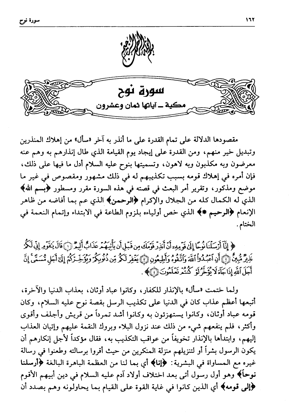مقصودها الدلالة على تمام القدرة على ما أنذر به آخر " سأل " من إهلاك المنذرين وتبديل خير منهم ، ومن القدرة على إيجاد يوم القيامة الذي طال إنذارهم به وهم عنه معرضون وبه مكذبون وبه لا هون ، وتسميتها بنوح عليه السلام أدل ما فيها على ذلك ، فإن أمره في إهلاك قومه بسبب تكذيبهم له في قصته في هذه السورة مقرر ومسطور ) بسم الله ( الذي له الكمال كله من الجلال والإكرام ) الرحمن ( الذي عم بما أفاضه من ظاهر الإنعام ) الرحيم ( الذي خص أولياءه بلزوم الطاعة في الابتداء وإتمام النعمة في الختام .