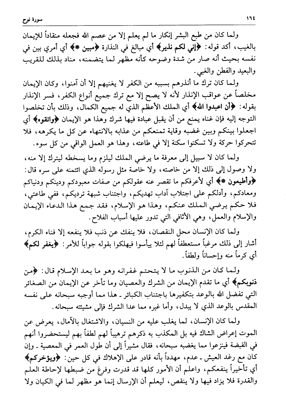 ولما كان من طبع البشر إنكار ما لم يعلم إلا من عصم الله فجعله منقاداً للإيمان بالغيب ، أكد قوله : ( إني لكم نذير ) أي مبالغ في النذارة ) مبين ) أي أمري بين في نفسه بحيث أنه صار من ضدة وضوحه كأنه مظهر لما يتضمنه ، مناد بذلك للقريب والبعيد والفطن والغبي .