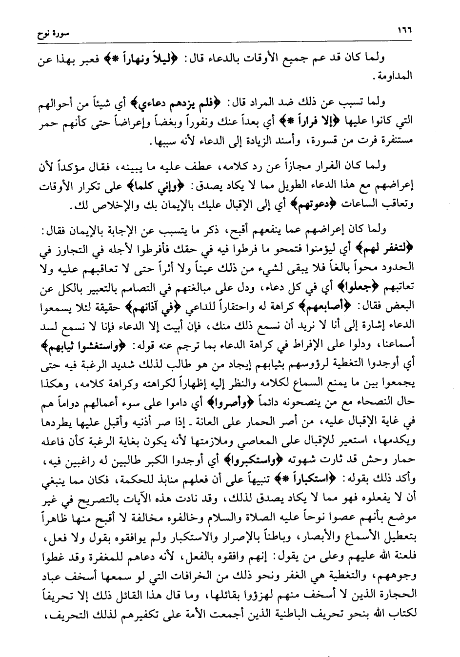 ولما كان إعراضهم عما ينفعهم أقبح ، ذكر ما يتسبب عن الإجابة بالإيمان فقال : ( لتغفر لهم ) أي ليؤمنوا فتمحو ما فرطوا فيه في حقك فأفرطوا لأجله في التجاوز في الحدود محواً بالغاً فلا يبقى لشيء من ذلك عيناً ولا أثراً حتى لا تعاقبهم عليه ولا تعاتبهم ) جعلوا ) أي في كل دعاء ، ودل على مبالغتهم في التصامم بالتعبير بالكل عن البعض فقال : ( أصابعهم ( كراهة له واحتقاراً للداعي ) في آذانهم ( حقيقة لئلا يسمعون الدعاء إشارة إلى أنا لا نريد أن نسمع ذلك منك ، فإن أبيت إلا الدعاء فإنا لا نسمع لسد أسماعنا ، ودلوا على الإفراط في كراهة الدعاء بما ترجم عنه قوله : ( واستغشوا ثيابهم ) أي أوجدوا التغطية لرؤوسهم بثيابهم إيجاد من هو طالب لذلك شديد الرغبة فيه حتى يجمعوا بين ما يمنع السماع لكلامه والنظر إليه إظهاراً لكراهته وكراهة كلامه ، وهكذا حال النصحاء مع من ينصحونه دائماً ) وأصروا ) أي داموا على سوء أعمالهم دواماً هم في غاية الإقبال عليه ، من أصر الحمار على العانة - إذا صر أذنيه وأقبل عليها يطردها ويكدمها ، استعير للإقبال على المعاصي وملازمتها لأنه يكون بغاية الرغبة كأن فاعله حمار وحش قد ثارت شهوته ) واستكبروا ) أي أوجدوا الكبر طالبين له راغبين فيه ، وأكد ذلك بقوله : ( استكباراً ( تنبيهاً على أن فعلهم منابذ للحكمة ، فكان مما ينبغي أن لا يفعلوه فهو مما لا يكاد يصدق لذلك ، وقد نادت هذه الآيات بالتصريح في غير موضع بأنهم عصوا نوحاً عليه الصلاة والسلام وخالفوه مخالفة لا أقبح منها ظاهراً بتعطيل الأسماع والأبصار ، وباطناً بالإصرار والاستكبار ولم يوافقوه بقول ولا فعل ، فلعنة الله عليهم وعلى من يقول : إنهم وافقوه بالفعل ، لأنه دعاهم للمغفرة وقد غطوا وجوههم ، والغطية هي الغفر ونخحو ذلك من الخرافات التي لو سمعها أسخف عباد الحجارة الذين لا أسخف منهم لهزؤوا بقائلها ، وما قال هذا القائل ذلك إلا تحريفاً لكتاب الله بنحو تحريف الباطنية الذين أجمعت الأمة على تكفيرهم لذلك التحريف ،