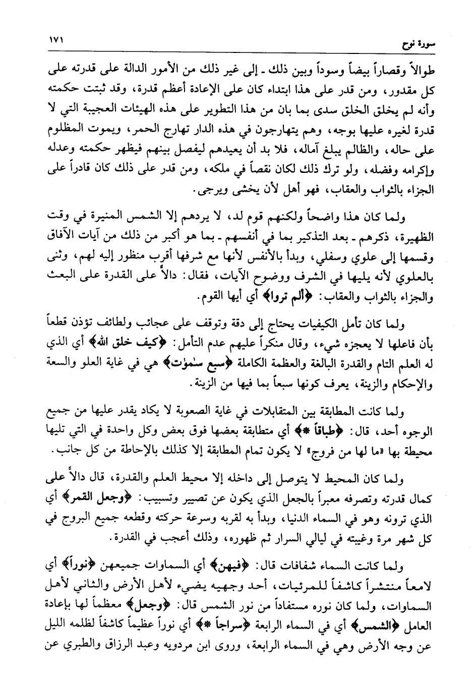 ولما كانت السماء شفافات قال : ( فيهن ) أي السماوات جميعهن ) نوراً ) أي لامعاً منتشراً كاشفاً للمرئيات ، أحد وجهيه يضيء لأهل الأرض والثاني لأهل السماوات ، ولما كان نوره مستفاداً من نور الشمس قال : ( وجعل ( معظماً لها بإعادة العامل ) الشمس ) أي في السماء الرابعة ) سراجاً ) أي نوراً عظيماً كاشفاً لظلمه الليل عن وجه الأرض وهي في السماء الرابعة ، وروى ابن مردويه وعبد الرزاق والطبري عن