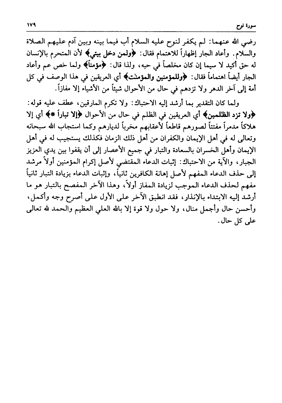 ولما كان التقدير بما أرشد إليه الاحتباك : ولا تكرم المارقين ، عطف عليه قوله : ( ولا تزد الظالمين ) أي العريقين في الظلم في حال من الأحوال ) إلا تباراً ) أي إلا هلاكاً مدمراً مفتتاً لصورهم قاطعاً لأعقابهم مخبراً لديارهم وكما استجاب الله سبحانه وتعالى له في أهل الإيمان والكفران من أهل ذلك الزمان فكذلك يستجيب له في أهل الإيمان وأهل الخسران بالسعادة والتبار في جميع الأعصار إلى أن يقفوا بين يدي العزيز الجبار ، والأية من الاحتباك : إثبات الدعاء المقتضي لأصل إكرام المؤمنين أولاً مرشد إلى حذف الدعاء المفهم لأصل إهانة الكافرين ثانياً ، وإثبات الدعاء بزيادة التبار ثانياً مفهم لحذف الدعاء الموجب لزيادة المفاز أولاً ، وهذا الآخر المصح بالتبار هو ما أرشد إليه الابتداء بالإنذار ، فقد انطبق الآخر على الأول على أصرح وجه وأكمل ، وأحسن حال وأجمل منال ، ولا حول ولا قوة إلا بالله العلي العظيم والحمد لله تعالى على كل حال .
