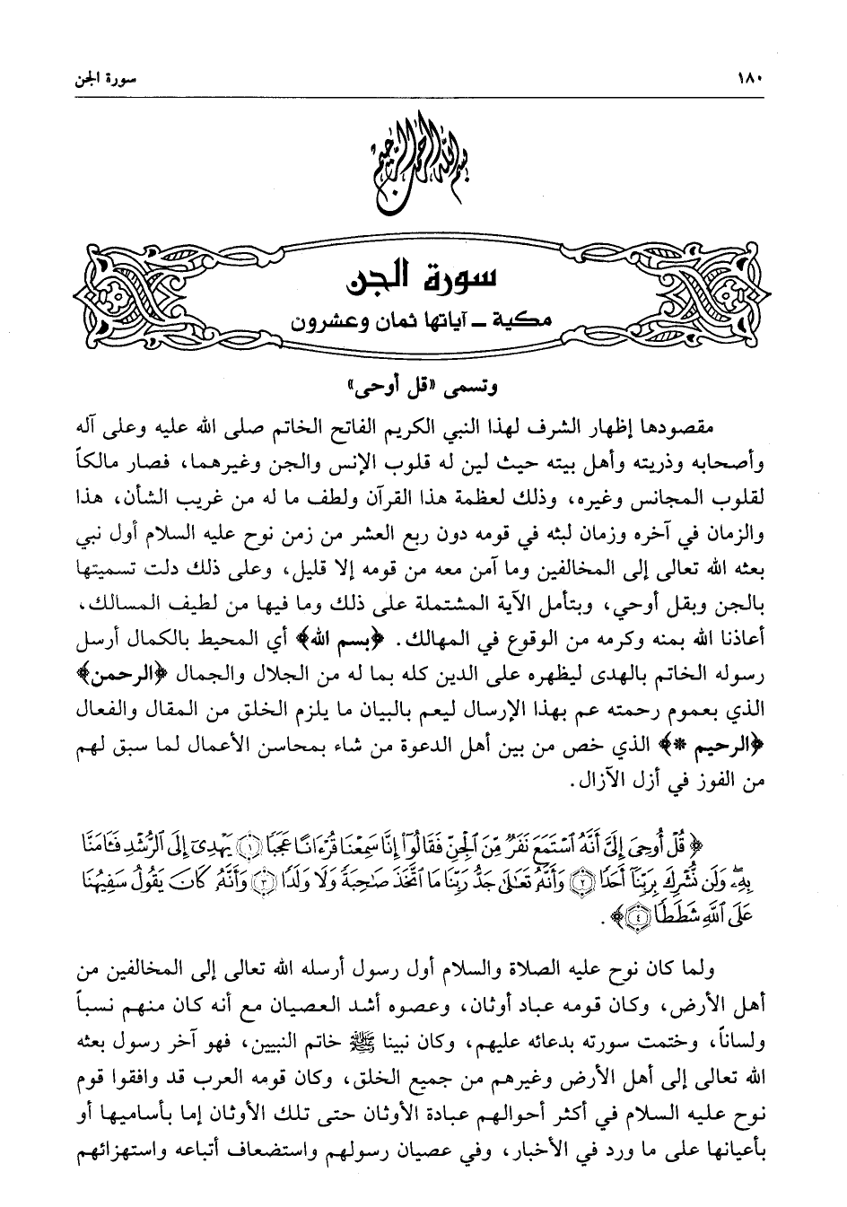 مقصودها إظهار الشرف لهذا النبي الكريم الفاتح ( صلى الله عليه وسلم ) وعلى أنه وأصحابه وذريته ، أهل بيته حيث لين له قلوب الإنس والجن وغيرهما ، فصار مالكا لقلوب المجانس وغيره ، وذلك لعظمة هذا القرآ ، ولطف ما له من غريب الشأن ، هذا والزمان في آخره وزمان لبثه في قومه دون ربع العشر من زمن نوح عليه السلام أول نبي بعثه الله تعالى إلى المخالفين وما آمن معه من قومه إلا قليل ، وعلى ذلك دلت تسميتها بالجن ويقل أوحي ، وبتأمل الآية المشتملة على ذلك وما فيها من لطيف المسالك ، أعاذنا الله بمنه وكرمه من الوقوع في المهالك ، ) بسم الله ) أي المحيط بالكمال أرسل رسوله الخاتم بالهدى ليظهره على الدين كله بما له من الجلال والجمال ) الرحمن ( الذي بعموم رحمته عم بهذا الإرسال ليعم بالبيان ما يلزم الخلق من المقال والفعال ) الرحيم ( الذي خص من بيتن أهل الدعوة من شاء بمحاسن الأعمال لما سبق لهم من الفوز في أزل الآزال .