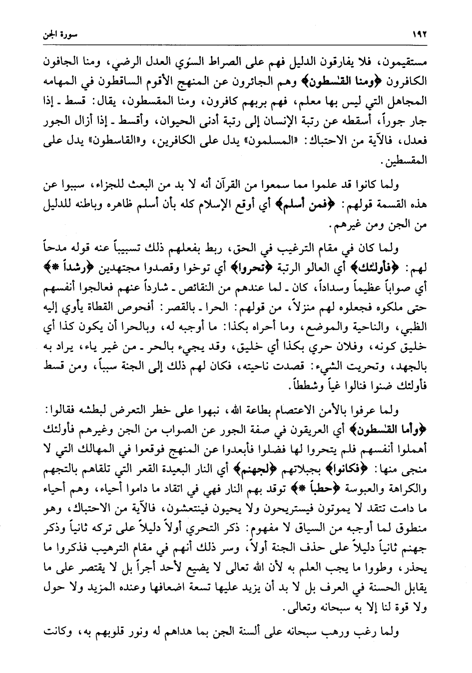 مستقيمون ، فلا يفارقون الدليل فهم على الصراط السوي العدل الرضي ، ومنا الجافون الكافرون ) ومنا القاسطون ( وهم الجائرون عن المنهج الأقوم الساقطون في المهامه المجاهل التي ليس بها معلم ، فهم بربهم كافرون ، ومنا المقسطون ، يقال : قسط - إذا جار جوراً ، أسقطه عن رتبة الإنسان إلى رتبة أدنى الحيوان ، وأقسط - إذا أزال الجور فعدل ، فالآية من الاحتباك : ( المسلمون ) يدل على الكافرين ، و ( القاسطون ) يدل على المقسطين .