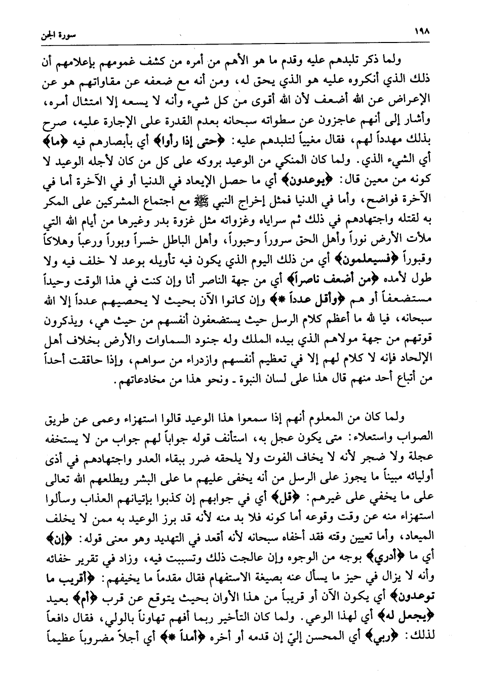 ولما ذكر تلبدهم عليه وقدم ما هو الأهم من أمره من كشف غمومهم بإعلامهم أن ذلك الذي أنكروه عليه هو الذي يحق له ، ومن أنه مع ضعفه عن مقاواتهم هو عن الإعراض عن الله أضعف لأن الله أقوى من كل شيء وأنه لا يسعه إلا امتثال أمره ، وأشار إلى أنهم عاجزون عن سطواته سبحانه بعدم القدرة على الإجارة عليه ، صرح بذلك مهداً لهم ، فقال مغيياً لتلبدهم عليه : ( حتى إذا رأوا ) أي بأبصارهم فيه ) ما ) أي الشيء الذي .