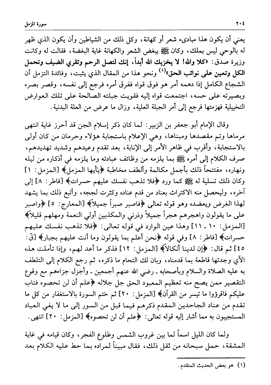 وقال الإمام أبو جعفر بن الزبير : لما كان ذكر إسلام الجن قد أحرز غاية انتهى إلى مرماها وتم مقصدها ومبناها ، وهي الإعلام باستجابة هؤلاء وحرمان من كان أولى بالاستجابة ، وأقرب في ظاهر الأمر إلى الإنابة ، بعد تقدم وعيدهم وشديد تهديدهم ، صرف الكلام إلى أمره ( صلى الله عليه وسلم ) بما يلزمه من وظائف عبادته وما يلزمه في أذكاره من ليله ونهاره ، مفتتحاً ذلك بأجمل مكالمة وألطف مخاطبة ) يا أيها المزمل ) [ المزمل : 1 ] وكان ذلك تسلية له صل الله عليه وسلم وكان تسلية ( صلى الله عليه وسلم ) كما ورد