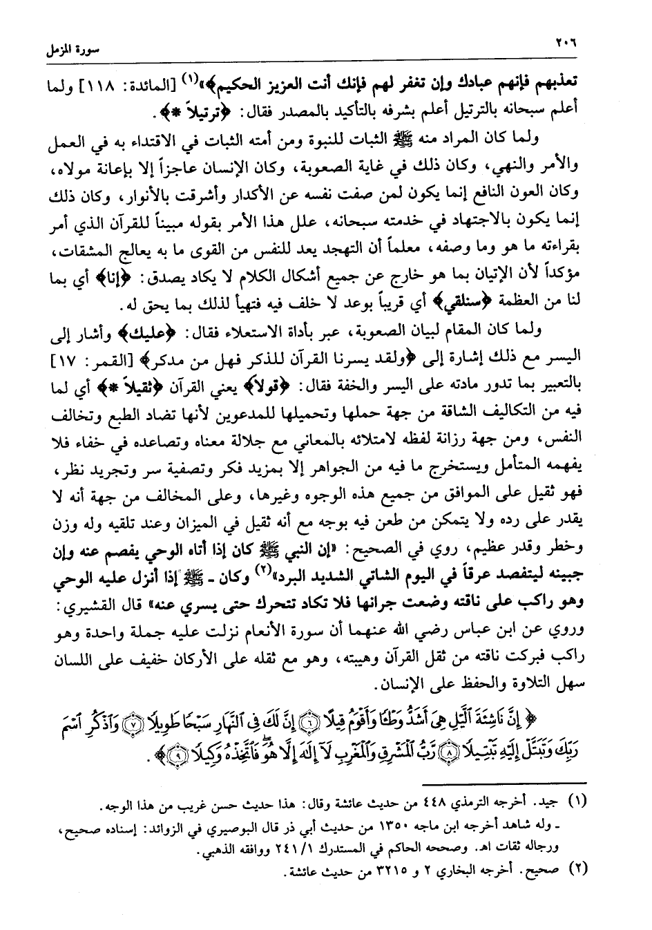 ) إِنَّ نَاشِئَةَ اللَّيْلِ هِيَ أَشَدُّ وَطْأً وَأَقْوَمُ قِيلاً إِنَّ لَكَ فِي النَّهَارِ سَبْحَاً طَوِيلاً وَاذْكُرِ اسْمَ رَبِّكَ وَتَبَتَّلْ إِلَيْهِ تَبْتِيلاً رَّبُّ الْمَشْرِقِ وَالْمَغْرِبِ لاَ إِلَهَ إِلاَّ هُوَ فَاتَّخِذْهُ وَكِيلاً ( ( )