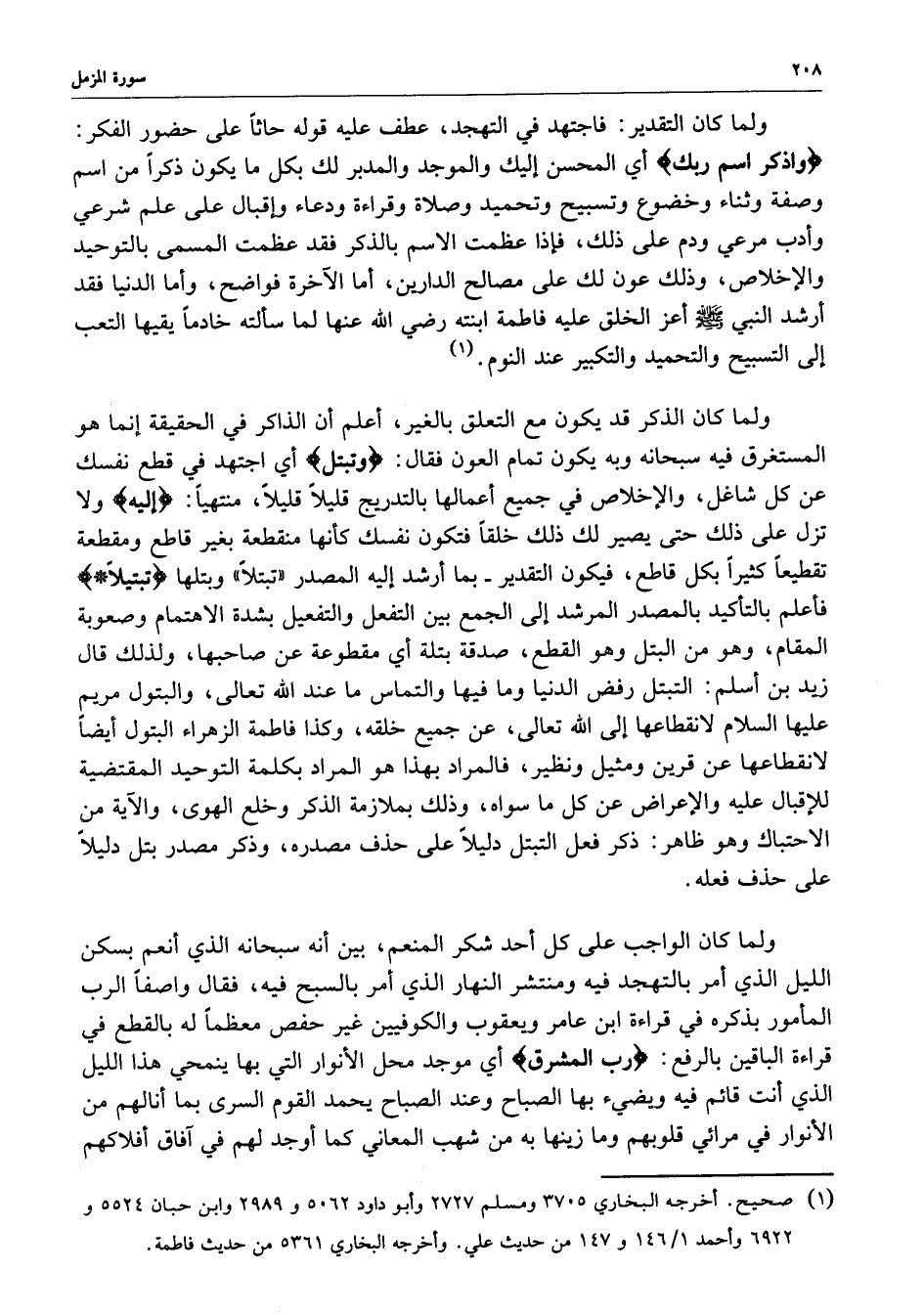 ولما كان الذكر قد يكون مع التعلق بالغير ، أعلم أن الذاكر في الحقيقة إنما هو المستغرق فيه سبحانه وبه يكون تمام العون فقال : ( وتبتل ) أي اجتهد في قطع نفسك عن كل شاغل ، والإخلاص في جميع أعمالها بالتدريج قليلاً قليلاً ، منتهياً : ( إليه ( ولا تزل على ذلك حتى يصير لك ذلك خلقاً فتكون نفسك كأنها منقطعة بغير قاطع ومقطعة تقطعياً كثيراً بكل قاطع ، فيكون التقدير - بما أرشد إليه المصدر ( تبتلاً ) وبتلها ) تبتيلاً ( فأعلم بالتأكيد بالمصدر المرشد إلى الجمع بين التفعل والتفعيل بشدة الاهتمام وصعوبة المقام ، وهو من البتل وهو القطع ، صدقة بتلة أي مقطوعة عن صاحبها ، ولذلك قال زيد بن أسلم : التبتل رفض الدنيا وما فيها والتماس ما عند الله تعالى ، والبتول مريم عليها السلام لانقطاعها إلى الله تعالى ، عن جميع خلقه ، وكذا فاطمة الزهراء البتول أيضاً لانقطاعها عن قرين ومثيل ونظير ، فالمراد بهذا هو المراد بكلمة التوحيد المقتضية للإقبال عليه والإعراض عن كل ما سواه ، وذلك بملازمة الذكر وخلع الهوى ، والآية من الاحتباك وهو ظاهر : ذكر فعل التبتل دليلاً على حذف مصدره ، وذكر مصدر بتل ديليلاً على حذف فعله .