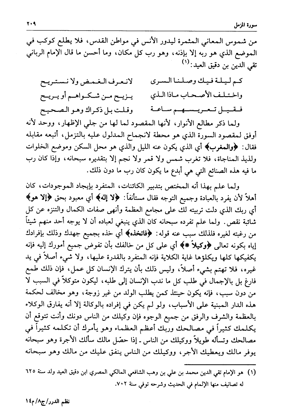 من شموس المعاني المثمرة ليدور الأنس في مواطن القدس ، فلا يطلع كوكب في الموضع الذي هو ربه إلا بإذنه ، وهو رب كل مكان ، وما أحسن ما قال الإمام الرباني تقي الدين بن دقيق العيد :