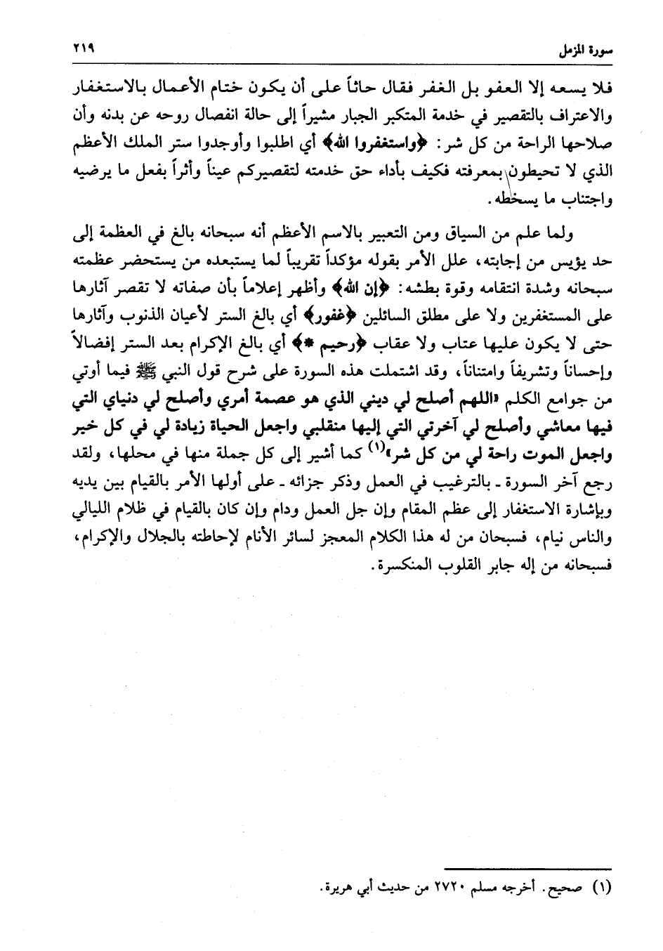 ولما علم من السياق ومن التعبير بالاسم الأعظم أنه سبحانه بالغ العظمة إللى حد يؤيس من إجابته ، علل الأمر بقوله مؤكدا تقريبا لما يستبعده من يستحضر عظمته سبحانه وشدة انتقامه وقوة بطشه " ) إن الله ( وأظهر إعلالما بأن صفاته لا تقصر آثارها على المستغفرين ولا على مطلق السائلين ) غفور ) أي بالغ الستر لأعيان الذنوب وآثارها حتى لا تكون عليها عتاب ولا عقاب ) رحيم ) أي بالغ الإكرام بعد الستر إفضالا وإحسانا وتشريفا وامتنانا وقد اشتملت هذه السورة على شرح قول النبي ( صلى الله عليه وسلم ) فيما أوتي من جوامع الكلم " اللهم أصلح لي ديني الذي هو عصمة أمري وأصلح لي دنياي التي فيها معاشي وأصلح لي آخرتي التي إليها منقلبي واجعل الحياة زيادة لي في كل خير واجعل الموت راحة لي من كل شر " كما أشير إلى كل جملة منها في محلهعنا ، ولقد رجع آخر السورة - بالترغيب في العمل وذكر جزائه - على أولها الأمكر بالقيام بين ييديه وبإشارة الاستغفار إلى عظمم المقام وإن جل العمل ودام وإن كان بالقيام في ظلام الليالي والناس نيام ، فسبحان من له هذا الكلام المعجز لسائر الأنام لأحاطته بالجلال والإكرام ، فسبحانه من إله جابر القلوب المنكسرة .