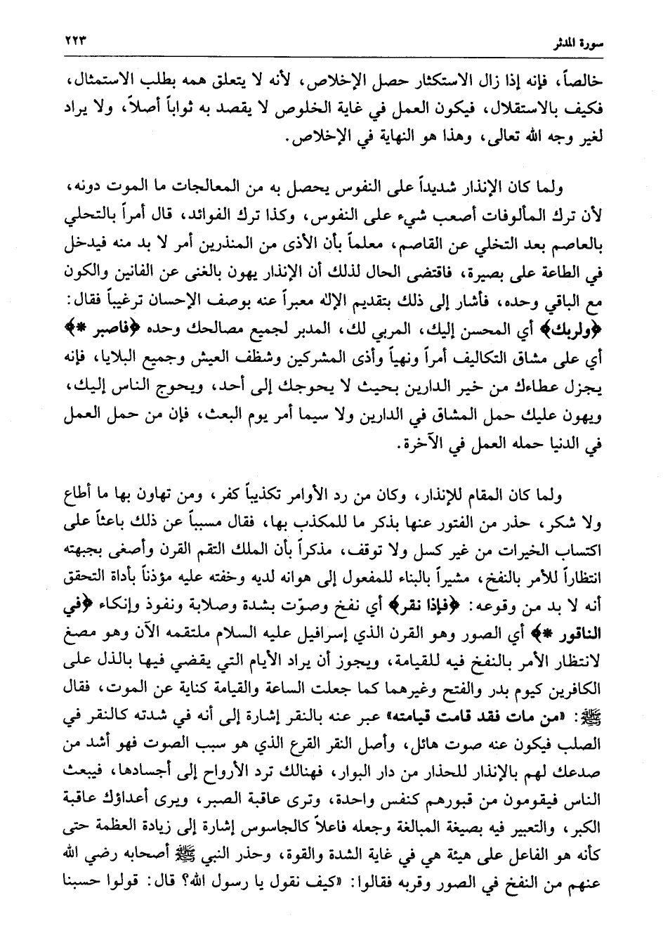 ولما كان المقام للإنذار ، وكان من رد الأوامر تكذيباً كفر ، ومن تهاون بها من أطاع ولا شكر ، حذر من الفتور عنها بذكر ما للمكذب بها ، فقال مسبباً عن ذلك باعثاً على اكتساب الخيرات من غير كسل ولا توقف ، مذكراً بن الملك التقم القرن وأصغى بجبهته انتظاراً للأمر بالنفخ ، مشيراً بالبناء للمفعول إلى هوانه لديه وخفته عليه مؤذناً بأداة التحقق أنه لا بد من وقوعه : ( فإذا نقر ) أي نفخ وصوّت بشدة وصلاة ونفوذ وإنكاء ) في الناقور ) أي الصور وهو القرن الذي إسرافيل عليه السلام ملتقمه الآن وهو مصغ لانتظار الأمر بالنفخ فيه للقيامة ، ويجوز أن يراد الأيام التي يقضي فيها بالذل على الكافرين كيوم بدر والفتح وغيرهما كما جعلت الساعة والقيامة كناية عن الموت ، فقال ( صلى الله عليه وسلم ) : ( من مات فقد قامت قيامته ) عبر عنه بالنقر إشارة إلى أنه في شدته كالنقر في الصلب فيكون عنه صوت هائل ، وأصل النقر القرع الذي هو سبب الصوت فهو أشد من صدعك لهم بالإنذار للحذار من دار البوار ، فهنالك ترد الأرواح إلى أجسادها ، فيبعث الناس فيقومون من قبورهم كنفس واحدة ، وترى عاقبة الصبر ، ويرى أعداؤك عاقبة الكبر ، والتعبير فيه بصيغة المبالغة وجعله فاعلاً كالجاسوس إشارة إلى زيادة العظمة حتى كأنه هو الفاعل على هيئة هي في غاية الشدة والقوة ، وحذر النبي ( صلى الله عليه وسلم ) أصحابه رضي الله عنهم من النفخ في الصور وقربه فقالوا : ( كيف نقول يا رسول الله ؟ قال : قولوا حسبنا