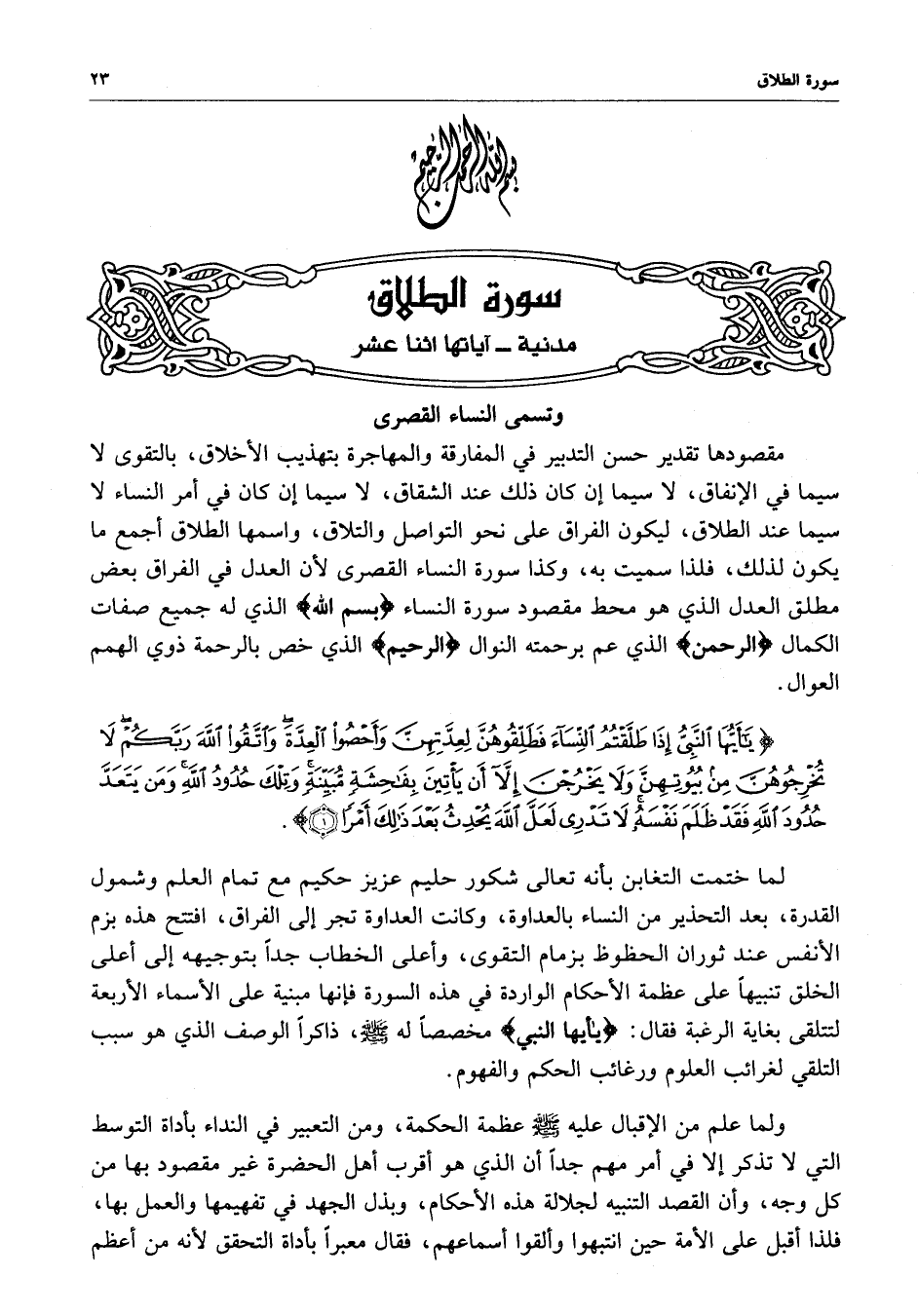 لمقصودها تقدير حسن التدبير في المفارقة والمهاجرة بتهذيب الأخلاق ، بالتقوى لا سيما في الإنفاق ، لا سيما إن كان ذلك عند الشقاق ، لا سيما إن كان في أمر النساء لا سيما عند الطلاق ، ليكونالفراق على نحو التواصل والتلاق ، واسمها الطلاق أجمع ما يكون لذلك ، فلذا سميت به وكذا سورة النساء القصرى لأن العدل في الفراق بعض مطلق العدل الذي هو محط مقصود سورة النساء ) بسم الله ( الذي له جميع صفات الكمال ) الرحمن ( الذي عم برحمته النوال ) الرحيم ( الذي خص بالرحمة ذوي الهمم العوال .
