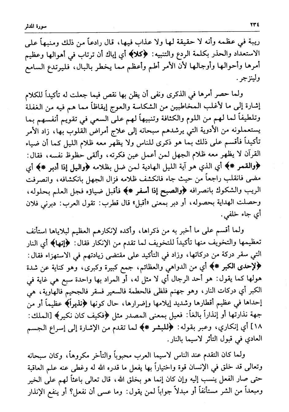 ولما حصر أمرها في الذكرى ونفى أن يظن بها نقص فيما جعلت له تأكيداً للكلام إشارة إلى ما لأغلب المخاطبين من الشكاسة والعوج إيقاظاً مام هم فيه من الغفلة وتلطيفاً لما لهم من اللوم والكثافة وتنبيهاً لهم على السعي في تقويم أنفسهم بما يستعملونه من الأدوية التي يرشدهم سبحانه إلى علاج أمراض القلوب بها ، زاد الأمر تأكدياً فأقسم على ذلك بما هو ذكرى للناس ولا يظهر معه ظلام الليل كما أن ضياء القرآن لا يظهر معه ظلام الجهل من أعمل عين فكرته ، وألقى حظوظ نفسه ، فقال : ( والقمر ) أي الذي هو آية الليل الهادية لمن ضل بظلامه ) واليل إذا أدبر ) أي مضى فانقلب راجعاً من حيث جاء فانكشف ظلامه فزال الجهل بانكشافه ، وانصرفت الريب والشكوك بانصراف ) والصبح إذا إسفر ( أقبل ضياؤه بجل العلم بحلوله ، وحصلت الهداية بحصوله ، أو دبر بمعنى ( أقبل ) قال قطرب : تقول العرب : دبرني فلان أي جاء خلفي .