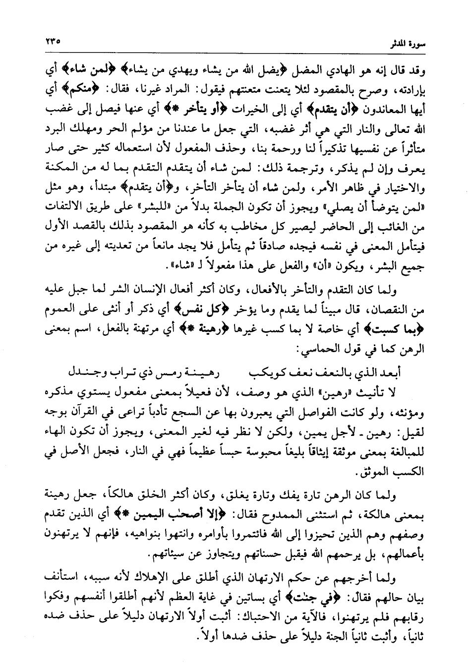 ولما كان الرهن تارة يفك وتارة يغلق ، وكان أكثر الخلق هالكاً ، جعل رهينة بمعنى هالكة ، ثم استثنى الممدوح فقال : ( إلا أصحاب اليمين ) أي الذين تقدم وصفهم وهم الذين تحيزوا إلى الله فائتمروا بأوامره وانتهوا بنواهيه ، فإنهم لا يرتهنون بأعمالهم ، بل يرحمهم الله فيقبل حسناتهم ويتجاوز عن سيئاتهم .