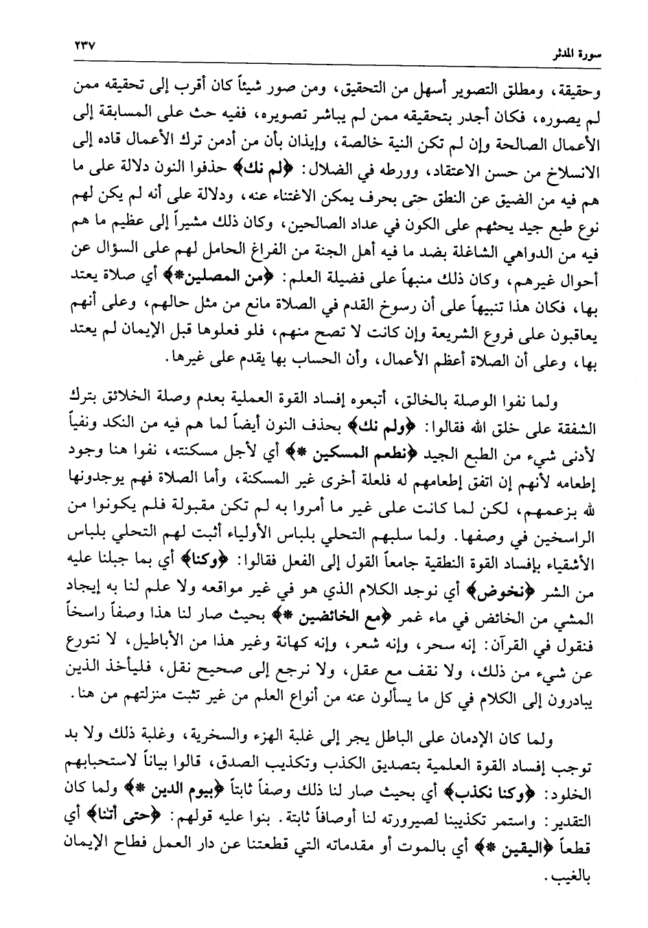 وحقيقة ، ومطلق التصوير أسهل من التحقيق ، ومن صور شيئاً كان أقرب إلى تحقيقه ممن لم يصوره ، فكان أجدر بتحقيقه ممن لم يباشر تصويره ، ففيه حث على المسابقة إلى الأعمال الصالحة وإن لم تكن النية خالصة ، وإيذان بأن من ادمن ترك الأعمال قاده إلى الانسلاخ من حسن الإعتقاد ، وورطه في الضلال ، ) لم نك ( حذفوا النون دلالة على ما هم فيه من الضيق عن النطق حتى بحرف يمكن الغتناء عنه ، ودلالة على أنه لم يكن لهم نوع طبع جيد يحثهم على الكون في عداد الصالحين ، وكان ذلك مشيراً غلى عظيم ما هم فيه من الدواهي الشاغلة بضد ما فيه أهل الجنة من الفراغ الحامل لهم على السؤال عن أحوال غيرهم ، وكان ذلك منبهاً على فضيلة العلم : ( من المصلين ) أي صلاة يعتد بها ، فكان هذا تنبيهاً على أن رسوخ القدم في الصلاة مانع من مثل حالهم ، وعلى أنهم يعاقبون على فروع الشريعة وإن كان لا تصح منهم ، فلو فعلوها قبل الإيمان لم يعتد بها ، وعلى أن الصلاة أعظم الأعمال ، وأن الحساب بها يقدم على غيرها .