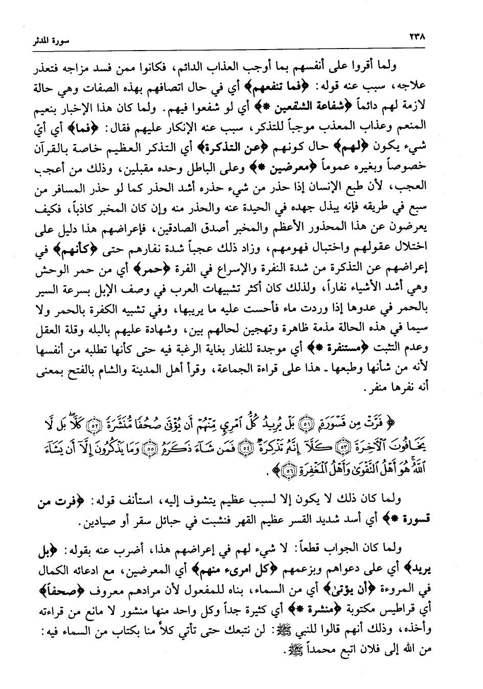 ) فَرَّتْ مِن قَسْوَرَةٍ بَلْ يُرِيدُ كُلُّ امْرِىءٍ مِّنْهُمْ أَن يُؤْتَى صُحُفاً مُّنَشَّرَةً كَلاَّ بَل لاَّ يَخَافُونَ الآخِرَةَ كَلاَّ إِنَّهُ تَذْكِرَةٌ فَمَن شَآءَ ذَكَرَهُ وَمَا يَذْكُرُونَ إِلاَّ أَن يَشَآءَ اللَّهُ هُوَ أَهْلُ التَّقْوَى وَأَهْلُ الْمَغْفِرَةِ ( ( )