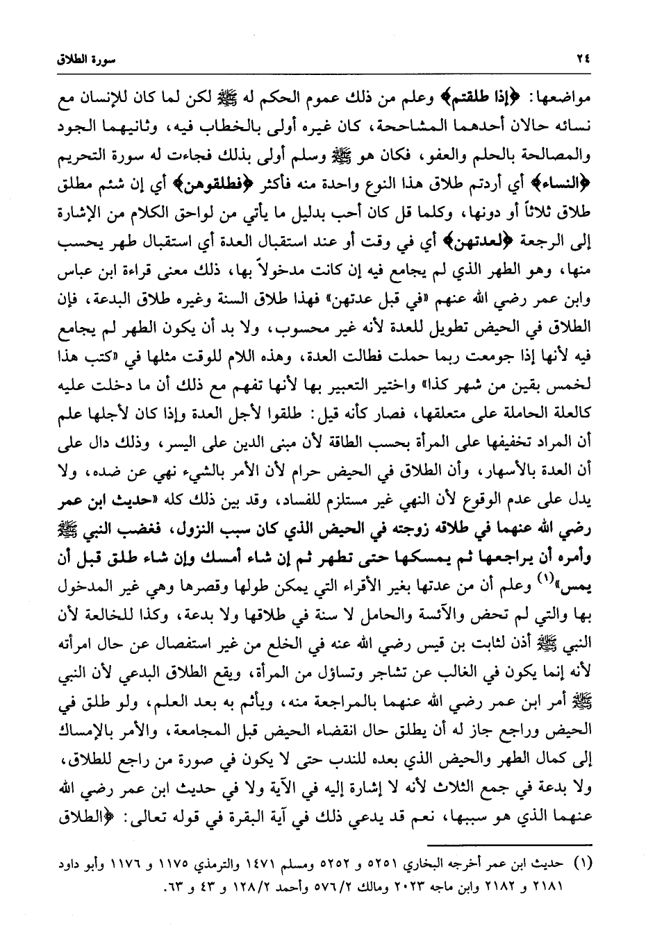 مواضعها : ( إذا طلقتم ( وعلم من ذلك عموم الحكم له ( صلى الله عليه وسلم ) لكن لما كان للإنسان مع نسائه حالان أحدهما المشاححة ، كان غيره أولى بالخطاب فيه ، وثانيهما الجود والمصالحة بالحلم والعفو ، فكان هو ( صلى الله عليه وسلم ) أولى بذلك فجاءت له سورة التحريم ) النساء ) أي أردتم طلاق هذا النوع واحدة منه فأكثر ) فطلقوهن ) أي إن شئتم مطلق طلاق ثلاثاً أو دونها ، وكلما قل كان أحب بدليل ما يأتي من لواحق الكلام من الإشارة إلى الرجعة ) لعدتهن ) أي في وقت أو عند استقبال العدة أي استقبال طهر يحسب منها ، وهو الطهر الذي لم يجامع فيه إن كانت مدخولاً بها ، ذلك معنى قراءة ابن عباس وابن عمر رضي الله عنهم ( في قبل عدتهن ) فهذا طلاق السنة وغيره طلاق البدعة ، فإن الطلاق في الحيث تطويل للعدة لأنه غير محسوب ، ولا بد أن يكون الطهر لم يجامع فيه لأنها إذا جومعت ربما حملت فطالت العدة ، وهذا اللام للوقت مثلها في ( كتب هذا لخمس بقين من شهر كذا ) واختير التعبير بها لأنها تفهم مع ذلك أن ما دخلت عليه كالعلة الحاملة على متعلقها ، فصار كأنه قيل : طلقوا لأجل العدة وإذا كان لأجلها علم أن المراد تخفيفها على المرأة بحسب الطاقة لأن مبنى الدين على اليسر ، وذلك دال على أن العدة بالأسهار ، وأن الطلاق في الحيض حرام لأن الأمر بشاء نهي عن ضده ، ولا يدل على عدم الوقوع لأن النهي غير مستلزم للفساد ، وقد بين ذلك كله ( حديث ابن عمر رضي الله عنهما في طلاقه زوجته في الحيض الذي كان سبب النزول ، فغضب النبي ( صلى الله عليه وسلم ) وأمره أن يراجعها ثم يمسكها حتى تطهر ثم إن شاء امسك وإن شاء طلق قبل أن يمس ) وعلم أن من عدتها بغير الأقراء التي يمكن طولها وقصرها وهي غير المدخول بها والتي لم تحض والآئسة والحامل لا سنة في طلاقها ولا بدعة ، وكذا للخالعة لأن النبي ( صلى الله عليه وسلم ) أذن لثابت بن قيس رضي الله عنه في الخلع من غير استفصال عن حال امرأته لأنه إنما يكون في الغالب عن تشاجر وتساؤل من المرأة ، ويقع الطلاق البدعي لأن النبي ( صلى الله عليه وسلم ) أمر ابن عمر رضي الله عنهما بالمراجعة منه ، ويأثم به بعد العلم ، ولو طلق في الحيض وراجع جاز له أن يطلق حال انقضاء الحيض قبل المجامعة ، والأمر بالإمساك إلى كمال الطهر والحيض الذي بعده للندب حتى لا يكون في صورة من راجع للطلاق ولا بدعة في جمع الثلاثة لأنه لا إشارة إله في الآية ولا في حديث ابن عمر رضي الله عنهما الذي هو سببها ، نعم قد يدعي ذلك في آية البقرة في قوله تعالى :