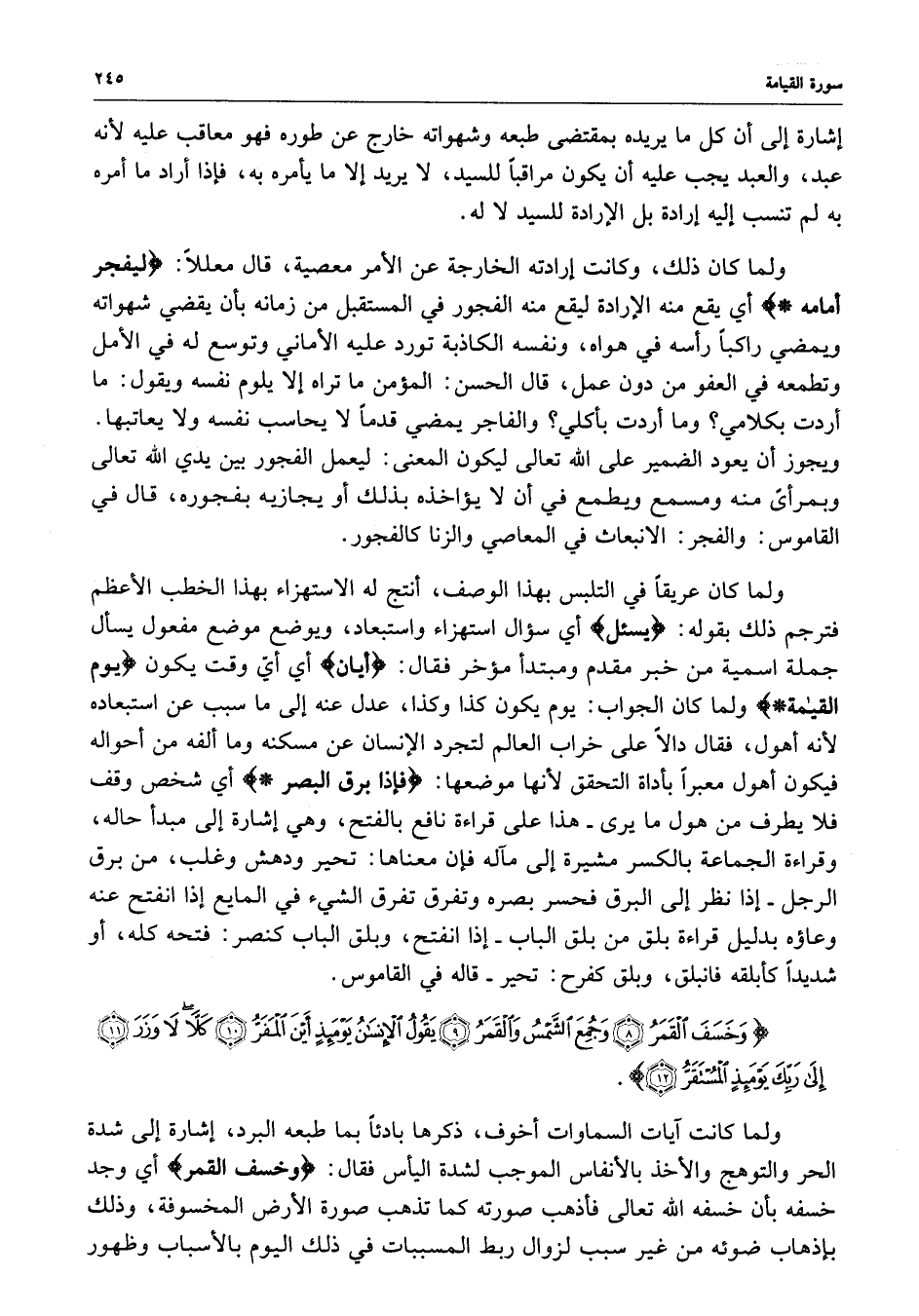 ) وَخَسَفَ الْقَمَرُ وَجُمِعَ الشَّمْسُ وَالْقَمَرُ يَقُولُ الإِنسَانُ يَوْمَئِذٍ أَيْنَ الْمَفَرُّ كَلاَّ لاَ وَزَرَ إِلَى رَبِّكَ يَوْمَئِذٍ الْمُسْتَقَرُّ ( ( )