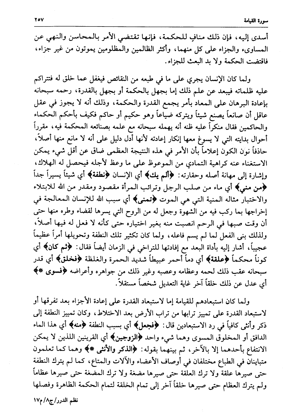 ولما كان الإنسان يجري على ما في طبعه من النقائص فيغفل عما خلق له فتتراكم عليه ظلماته فيبعد عن علم ذلك إما بجهل بالحكمة أو بجهل بالقدرة ، رحمه سبحانه بإعادة البرهان على المعاد بأمر يجمع القدرة والحكمة ، وذلك أنه لا يجوز في عقل عاقل أن صانعاً يصنع شيئاً ويتركه ضياعاً وهو حكيم أو حاكم فكيف بأحكم الحكماء والحاكمين فقال منكراً عليه ظنه أنه يهمله سبحانه مع علمه بصنائعه المحكمة فيه ، مقرراً أحوال بدايته التي لا يسوغ معها إنكار إعادته لأنها أدل على أنه لا مانع منها أصلاً ، حاذفاً نون الكون إعلاماً بأن الأمر في هذه النتيجة العظمى ضاق عن أقل شيء يمكن الاستغناء عنه كراهية التمادي من الموعوظ على ما وعظ لاجله فيحصل له الهلاك ، وإشارة إلى مهانة أصله وحقارته : ( ألم يك ) أي الإنسان ) نطفة ) أي شيئاً يسيراً جداً ) من مني ) أي ماء من صلب الرجل وترائب المرأة مقصود ومقدر من الله لابتلاء إخرادجها بما ركب فيه من الشهوة وجعل له من الروح التي يسرها لقضاء وطره منها حتى أن وقت صبها في الرحم انصبت منه بغير اختياره حتى كأنه لا فعل له فيها أصلاً ، ولذلك بنى الفعل لما لم يسم فاعله ، ولما كان تكثير تلك النطفة وتحويلها أمراً عظيماً عجيباً ، أشار إليه بأداة البعد مع إفادتها للتراخي في الزمان أيضاً فقال : ( ثم كان ) أي كوناً محكماً ) علقة ) أي دماً أحمر عبيطاً شديد الحمرة والغلظة ) فخلق ) أي قدر سبحانه عقب ذلك لحمه وعظامه وعصبه وغير ذلك من جواهره وأعراضه ) فسوى ) أي عدل عن ذلك خلقاً آخر غاية التعديل شخصاً مستقلاً .