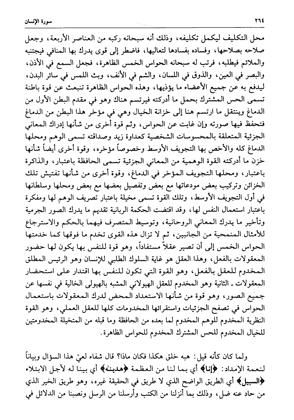 محل التكليف ليكمل تكليفه ، وذلك أنه سبحانه ركبه من العناصر الأربعة ، وجعل صلاحه بصلاحها ، وفساده بفسادها لتعاليها ، فاضطر إلى قوى يدرك بها المنافي فيجتنبه والملائم فيطلبه ، فرتب له سبحانه الحواس الخمس الظاهرة ، فجعل السمع في الأذن ، والبصر في العين ، والذوق في اللسان ، والشم في الأنف ، وبث اللمس في سائر البدن ، ليدفع به عم جميع الأعضاء ما يؤذيها ، وهذه الحواس الظاهر تنبعث عن قوة باطنة تمسى الحس المشترك بحمل ما أدركته فيرتسم هناك وهو في مقدم البطن الأول من الدماغ وينتقل ما ارتسم هنا إلى خزانة الخيال وهي في مؤخر هذا البطن منالدماغ فتحفظ فيها صورته وإن غابت عن الحواس ، وثم قوة أخرى من شأنها إدراك المعاني الجزئية المتعلقة بالمحسوسات الشخصية كعداوة زيد وصداقته تسمى الوهم ومحلها الدماغ كله والأخص بها التجويف الاوسط وخصوصاً مؤخره ، وقوة أخرى أيضاً شأنها خزن ما أدركته القوة الوهمية من المعاني الجزئية تسمى الحافظة باعتبار ، والذاكرة باعتبار ، ومحلها التجويف المؤخر في الدماغ ، وقوة أخرى من شأنها تفتيش تلك الخزائين وتركيب بعض مودعاتها مع بعض وتفصيل بعضها مع بعض ومحلها وسلطانها في أول التجويف الأوسط ، وتلك القوة تسمى مخيلة باعتبار تصريف الوهم لها ومفكرة باعتبار استعمال النفس لها ، وقد اقتضت الحكمة الربانية تقديم ما يدرك الصور الجرمية وتأخير ما يدرك المعاني الروحانية ، وتوسيط المتصرف فيهما بالحكم والاسترجاع للأمثال المنمحية من الجانبين ، ثم لا تزال هذه القوى تخدم ما فوقها كما خدمتها الحواس الخمس إلى أن تصير عقلاً مستفاداً ، وهو قوة للنفس بها يكون لها حضور المعقولات بالفعل ، وهذا العقل هو غاية السلوك الطلبي للإنسان وهو الرئيس المطلق المخدوم للعقل بالفعل ، وهو القوة التي تكون للنفس بها اقتدار على استحضار المعقولات - الثانية وهو المخدوم للعقل الهيولاني المشبه بالهيولى الخالية في نفسها عن جميع الصورة ، وهو قة من شأنها الاستعداد المحض لدرك المعقولات باستعمال الحواس في تصفيح الجزئيات واستقرائها المخدومات كلها للعقل العملي ، وهو القوة النظرية المخدوم للهم والمخدوم لما بعده من الحافظة وما قبله من المتخيلة المخدومتين للخيال المخدوم للحس المشترك المخدوم للحواس الظاهرة .