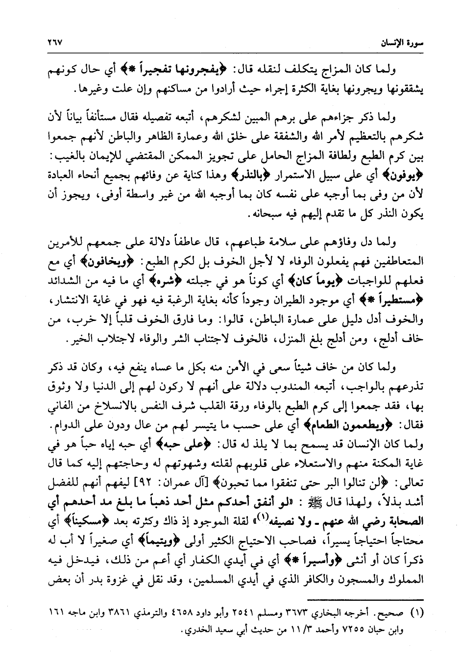 [ آل عمران : 92 ] ليفهم أنهم للفضل أشد بذلاً ، ولهذا قال ( صلى الله عليه وسلم ) : ( لو أنفق أحدكم مثل أحد ذهباً ما بلغ مد أحدهم أي الصحابة رضي الله عنهم - ولا نصيفه ) لقلة الموجود إذ ذاك وكثرته بعد ) مسكيناً ) أي محتاجاً احتياجاً يسيراً ، فصاحب الاحتياج الكثير أولى ) ويتيماً ) أي صغيراً لا أب له ذكراً كان أو أنثى ) وأسيراً ) أي في أيدي الكفار أي أعم من ذلك ، فيدخل فيه المملوك والمسجون والكفار الذي في أيدي المسلمين ، وقد نقل في غزوة بد أن بعض