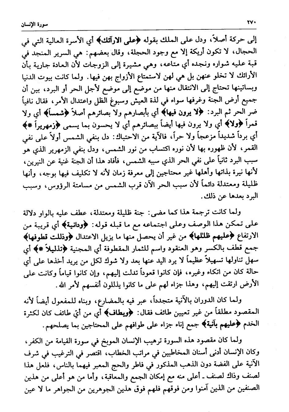 إلى حركة أصلاً ، ودل على الملك بقوله ) على الأرائك ) أي الأسرة العالية التي في الحجال ، لا تكون أريكة إلا مع وجود الحجلة ، وقال بعضهم : هي السرير المنجد في قبة عليه شواره ونجده أي متاعه ، وهي مشيرة إلى الزوجات لأن العادة جارية بأن الأرئك لا تخلو عنهن بل هي لهن لاستمتاع الأزواج بهن فيها .