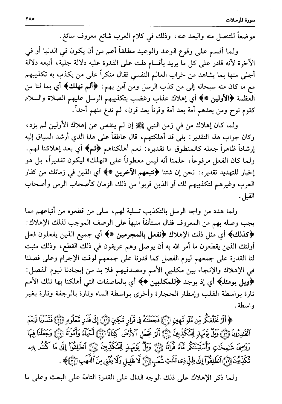 ) أَلَمْ نَخْلُقكُّم مِّن مَّآءٍ مَّهِينٍ فَجَعَلْنَاهُ فِي قَرَارٍ مَّكِينٍ إِلَى قَدَرٍ مَّعْلُومٍ فَقَدَرْنَا فَنِعْمَ الْقَادِرُونَ وَيْلٌ يَوْمَئِذٍ لِّلْمُكَذِّبِينَ أَلَمْ نَجْعَلِ الأَرْضَ كِفَاتاً أَحْيَآءً وَأَمْواتاً وَجَعَلْنَا فِيهَا رَوَاسِيَ شَامِخَاتٍ وَأَسْقَيْنَاكُم مَّآءً فُرَاتاً وَيْلٌ يَوْمَئِذٍ لِّلْمُكَذِّبِينَ انطَلِقُواْ إِلَى مَا كُنتُمْ بِهِ تُكَذِّبُونَ انطَلِقُواْ إِلَى ظِلٍّ ذِي ثَلاَثِ شُعَبٍ لاَّ ظَلِيلٍ وَلاَ يُغْنِي مِنَ اللَّهَبِ ( ( )