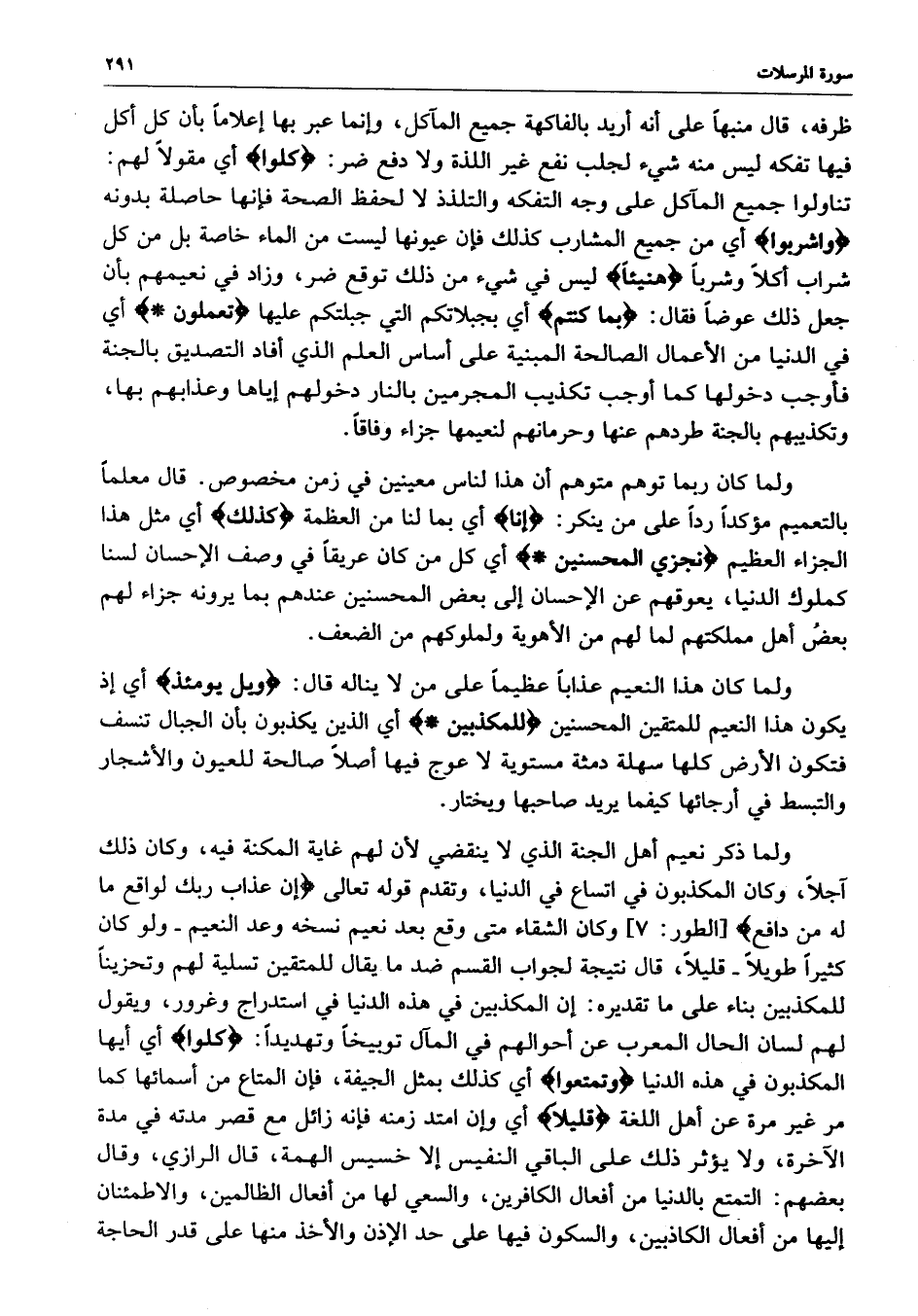 [ الطور : 7 ] وكان الشقاء متى وقع بعد نعيم نسخه وعد النعيم ولو كان كثيراً طويلاً قليلاً ، قال نتيجة لجواب القسم ضد ما يقال للمتقين تسلية لهم وتحزيناً للمكذبين بناء على ما تقديره : إن المكذبين في هذه الدنيا في استدراج وغرور ، ويقول لهم لسان الحال المعرب عن أحوالهم في المآل توبيخاً وتهديداً : ( كلوا ) أي أيها المكذبون في هذه الدنيا ) وتمتعوا ) أي كذلك بمثل اليجفة ، فإن المتاع من أسمائها كما مر غير مرة عن أهل اللغة ) قليلاً ) أي وإن امتد زمنه فإنه زائل مع قصر مدته في مدة الآخرة ، ولا يؤثر ذلك على الباقي النفيس إلا خسيس الهمة ، قال الرازي ، وقال بعضهم : التمتع بالدنيا من أفعال الكافرين ، والسعي لها من افعال الظالمين ، والاطمئنان إليها من أفعال الكاذبين ، والسكون فيها على حد الإذن والأخذ منها على قدر الحاجة