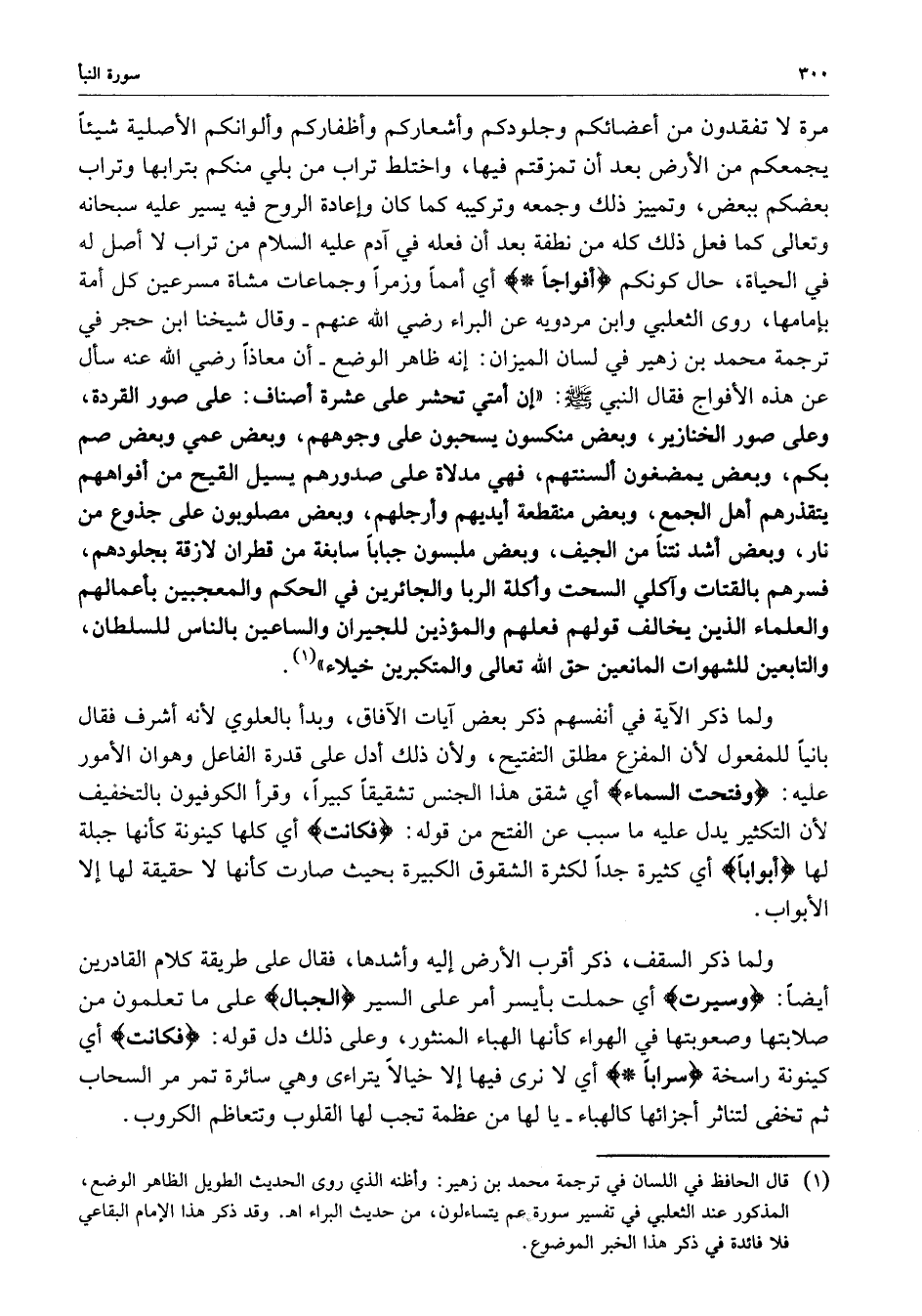 مرة لا تفقدون من أعضائكم وجلودكم وأشعاركم وأظفاركم وألوانكم الأصلية شيئاً يجمعكم من الأرض بعد أن تمزقتم فيها ، واختلط تراب من بلي منكم بترابها وتراب بعضكم ببعض ، وتمييز ذلك وجمع وتركيبه كما كان وإعادة الروح فيه يسير عليه سبحانه وتعالى كما فعل ذلك كله من نطفة بعد أن فعله في آدم عليه السلام من تراب لا أصل له في الحياة ، حال كونكم ) أفواجاً ) أي أمماً وزمراً وجماعات مشاة مسرعين كل أمة بإمامها ، روى الثعلبي وابن مدرويه عن البراء رضي الله عنهم وقال شيخنا ابن حجر في ترجمة محمد بن زهير في لسان الميزان : إنه ظاهر الوضع أن معاذاً رضي الله عنه سأل عن هذه الأفواج فقال النبي ( صلى الله عليه وسلم ) : ( إن أمتي تحشر على عشرة أصناف : على صور القردة ، وعلى صور الخنازير ، وبعض منكسون يسحبون على وجوههم ، وبعض عمي وبعض صم بكم ، وبعض يمضغون ألسنتهم ، فهي مدلاة على صدورهم يسيل القيح من أفواههم يتقذرهم أهل الجمع ، وبعض منقطعة أيديهم وأرجلهم ، وبعض مصلبون على جذوع من نار ، وبعض أشد نتناً من الجيف ، وبعض ملبسون جباباً سابغة من قطرن لازقة بجلودهم ، فسرهم بالقتات وآكلي السحت وأكلة الربا والجائرين في الحكم والمعجبين بأعمالهم والعلماء الذي يخالف قولهم فعلهم والمؤذين للجيران والساعين بالناس للسطان ، والتابعين للشهوات المانعين حق الله تعالى والتكبرين خيلاء ) .