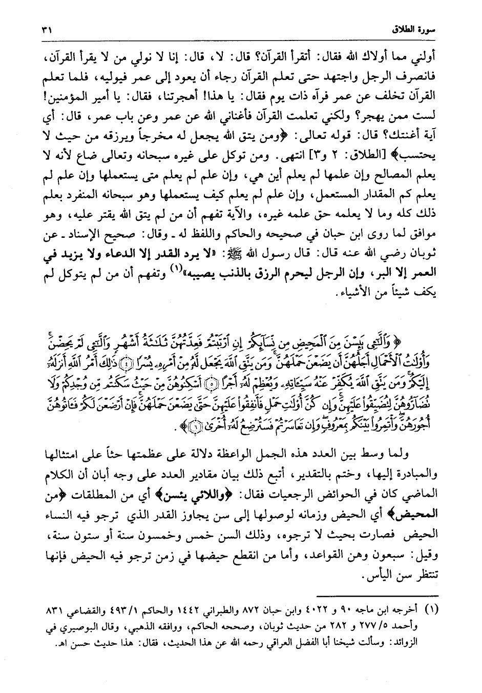 ) وَاللاَّئِي يَئِسْنَ مِنَ الْمَحِيضِ مِن نِّسَآئِكُمْ إِنِ ارْتَبْتُمْ فَعِدَّتُهُنَّ ثَلاَثَةُ أَشْهُرٍ وَاللاَّتِي لَمْ يَحِضْنَ وَأُوْلاَتُ الأَحْمَالِ أَجَلُهُنَّ أَن يَضَعْنَ حَمْلَهُنَّ وَمَن يَتَّقِ اللَّهَ يَجْعَل لَّهُ مِنْ أَمْرِهِ يُسْراً ذَلِكَ أَمْرُ اللَّهِ أَنزَلَهُ إِلَيْكُمْ وَمَن يَتَّقِ اللَّهَ يُكَفِّرْ عَنْهُ سَيِّئَاتِهِ وَيُعْظِمْ لَهُ أَجْراً أَسْكِنُوهُنَّ مِنْ حَيْثُ سَكَنتُم مِّن وُجْدِكُمْ وَلاَ تُضَآرُّوهُنَّ لِتُضَيِّقُواْ عَلَيْهِنَّ وَإِن كُنَّ أُوْلاَتِ حَمْلٍ فَأَنفِقُواْ عَلَيْهِنَّ حَتَّى يَضَعْنَ حَمْلَهُنَّ فَإِنْ أَرْضَعْنَ لَكُمْ فَآتُوهُنَّ أُجُورَهُنَّ وَأْتَمِرُواْ بَيْنَكُمْ بِمَعْرُوفٍ وَإِن تَعَاسَرْتُمْ فَسَتُرْضِعُ لَهُ أُخْرَى ( ( )