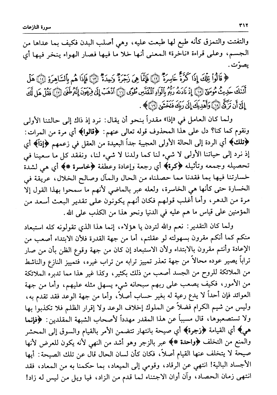 ) قَالُواْ تِلْكَ إِذاً كَرَّةٌ خَاسِرَةٌ فَإِنَّمَا هِيَ زَجْرَةٌ وَاحِدَةٌ فَإِذَا هُم بِالسَّاهِرَةِ هَلْ أَتَاكَ حَدِيثُ مُوسَى إِذْ نَادَاهُ رَبُّهُ بِالْوَادِي الْمُقَدَّسِ طُوًى اذْهَبْ إِلَى فِرْعَوْنَ إِنَّهُ طَغَى فَقُلْ هَل لَّكَ إِلَى أَن تَزَكَّى وَأَهْدِيَكَ إِلَى رَبِّكَ فَتَخْشَى ( ( )
