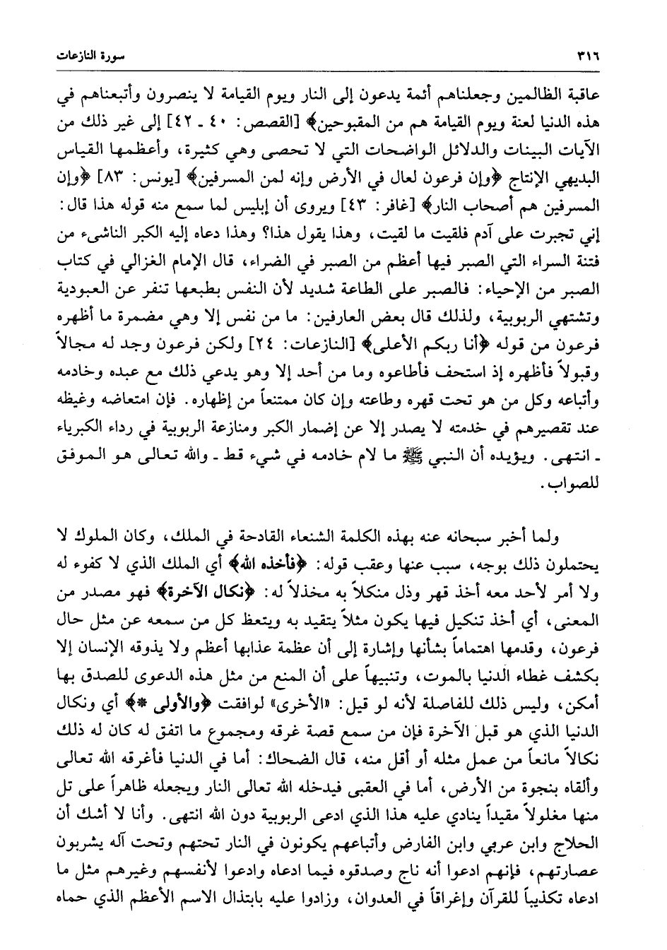 [ غافر : 43 ] ويروى أن إبليس لما سمع منه قوله هذا قال : إني تجبرت على آدم قلقيت ما لقيت ، وهذا يقول هذا ؟ وهذا دعاه إليه الكبر الناشئ من فتنة السراء التي الصبر فيها أعظم من الصبر في الضراء ، قال الإمام الغزالي في كتاب الصبر من الإحياء : فالصبر على الطاعة شديد لأن النفس بطبعها تنفر عن العبودية وتشتهي الربوبية ، ولذلك قال بعض العارفين : ما من نفس إلا وهي مضمرة ما أظهره فرعون من قوله ) أنا ربكم الأعلى ) [ النازعات : 24 ] ولكن فرعون وجد له مجالاً وقوبولاً فأظهره إذ استحف فأطاعوه وما من أحد إلا وهو يدعي ذلك مع عبده وخادمه وأتباعه وكل من هو تحن قهره وطاعته وإن كان ممتنعاً من إظهاره ، فإن امتعاضه وغيظه عند تقصيرهم في خدمته لا يصدر إلا عن إضمار الكبر ومنازعة الربوبية في رداء الكبرياء انتهى .