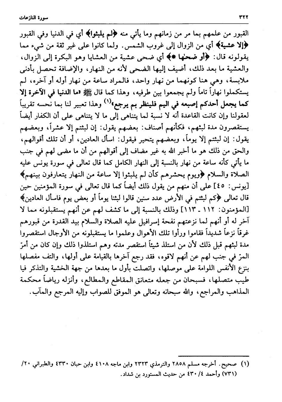 [ المؤمنون : 112 113 ] وذلك بالنسبة إلى ما كشف لهم عن أنهم يستقبولنه مما لا آخر له أو أنهم لما نزعتهم نفحة إسرافيل عليه الصلاة والسلام بيد القدرة من قبورهم غرقاً نزعاً شديداً فقاموا ورأوا تلك الأهوال وعلموا ما يستقبلونه من الأوجال استقصروا مدة لبثهم قبل ذلك لأن من استلذ شيئاً استقصر مدته وهم استلذوةا ذلك وإن كان من أمرّ المرّ في جنب لهم عن أنهم لاقوه ، فقد رجع آخرها بالقيامة على أولها ، والتف مفصلها بنزع الأنفس اللوامة على موصلها ، واتصلت بأول ما بعدها من جهة الخشية والتذكر فيا طيب متصلها ، فسبحان من جعله متعانق المقاطع والمطالع ، وأنزله رياضاً محكمة المذاهب والمراجع ، والله سبحانه وتعالى هو الموفق للصواب وإليه المرجع والمآب .