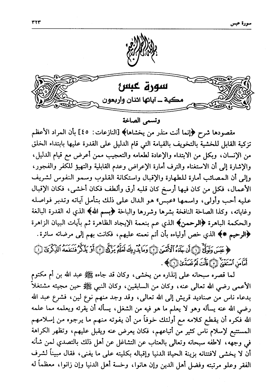 ) عَبَسَ وَتَوَلَّى أَن جَآءَهُ الأَعْمَى وَمَا يُدْرِيكَ لَعَلَّهُ يَزَّكَّى أَوْ يَذَّكَّرُ فَتَنفَعَهُ الذِّكْرَى أَمَّا مَنِ اسْتَغْنَى فَأَنتَ لَهُ تَصَدَّى ( ( )