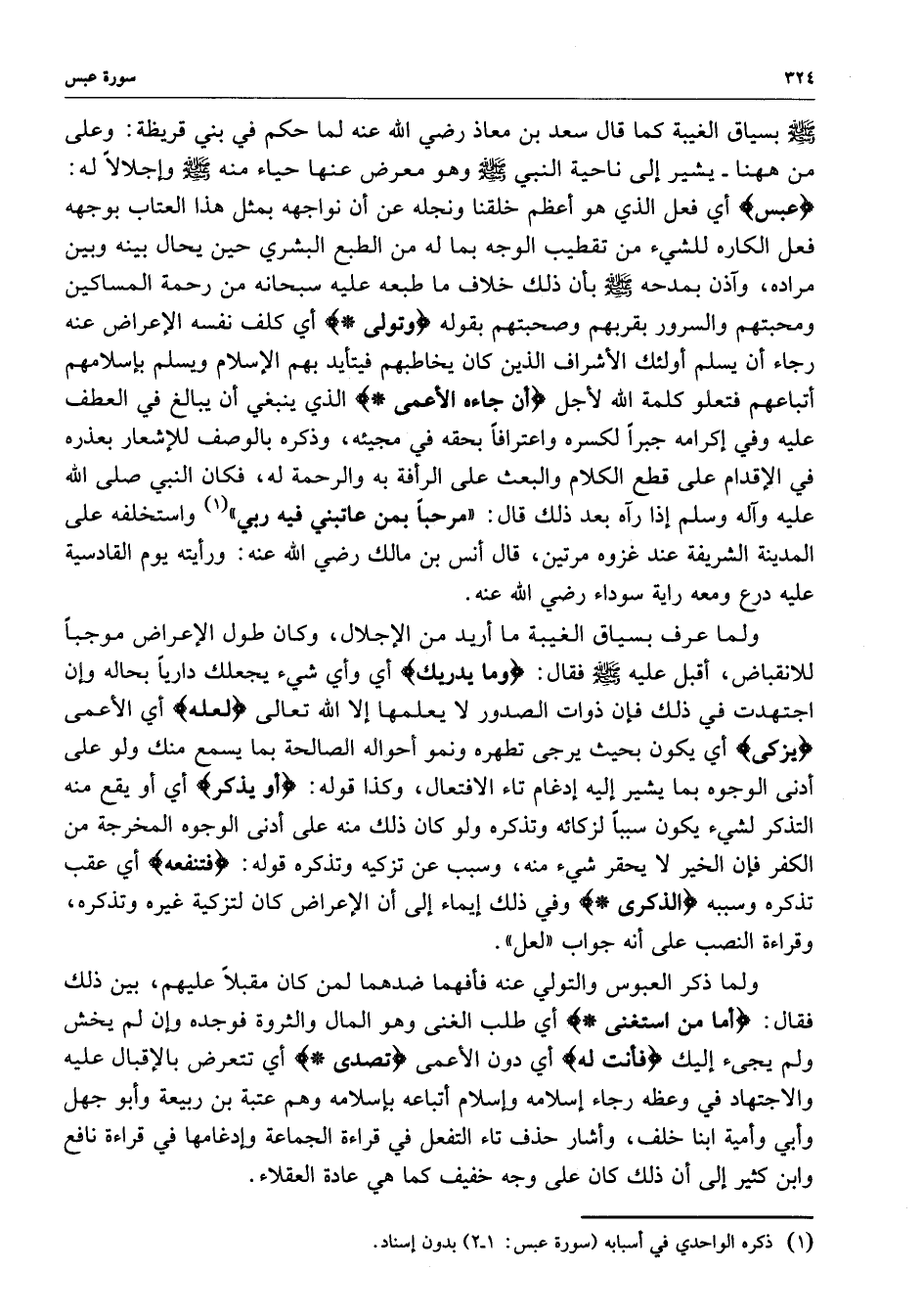 ( صلى الله عليه وسلم ) بسياق الغيبة كما قال سعد بن معاذ رضي الله عنه لما حكم في بني قريظة : وعلى من ههنا يشير إلى ناحية النبي ( صلى الله عليه وسلم ) وهو معرض عنها حياء منه ( صلى الله عليه وسلم ) وإجلالاً له : ( عبس ) أي فعل الذي هو أعظم خلقنا ونجله عن أن نواجهه بمثل هذا العتاب بوجهه فعل الكاره للشيء من تقطيب الوجه بما له من الطبع البشري حين يحال بينه وبين مراده ، وآذن بمدحه ( صلى الله عليه وسلم ) بأن ذلك خلاف ما طبعه عليه سبحانه من حرمة المساكين ومحبتهم والسرور بقرهم وصحبتهم بقوله ) وتولى ) أي كلف نفسه الإعراض عنه رجاء أن يسلم أولئك الأشراف الذين كان يخاطبهم فيتأيد بهم الإسلام ويسلم بإسلامهم أتباعهم فتلعو كلمة الله لأجل ) أن جاءه الأعمى ( الذي ينبثي أن يبالغ في العطف عليه وفي إكرامه جبراً لكسره واعترافاً بحقه في مجيئه ، وذكره بالوصف للإشعار بعذره في الإقدام على قطع الكلام والبعث على الرأفة به والحرمة له ، فكان النبي صلى الله عليه وآله وسلم إذا رآه بعد ذلك قال : ( مرحباً بمن عاتبني فيه ربي ) واستخلفه على المدينة الشريفة عند غزوه مرتين ، قال أنس بن مالك رضي الله عنه : ورأيته يوم القادسية عليه درع ومعه راية سواداء رضي الله عنه .