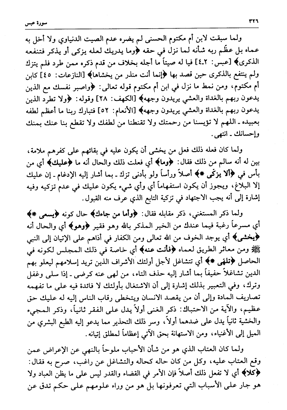 ولما كان العتاب الذي هو من شأن الأحباب ملوحاً بالنهي عن الإعراض عمن وقع العتاب عليه ، وكل من كان حاله كحاله والتشاغل عن راغب ، صرح به فقال : ( كلا ) أي لا تفعل ذلك أصلاً فإن الأمر في القضاء والقدر ليس على ما يظن العباد ولا هو جار على الأسباب التي تعرفونها بل هو من وراء علومهم على حكم تدق عن