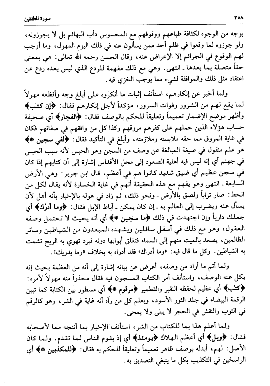 ولما أخبر عن إنكارهم ، استأنف إثبات ما أنكروه على أبلغ وجه وأفظعه مهولاً لما يقع لهم من الشرور وفوات السرور ، مؤكداً لأجل إنكارهم فقال : ( إن كتاب ( وأظهر موضع الإضمار تعميماً وتعليقاً للحكم بالوصف فقال : ( الفجار ) أي صحيفة حساب هؤلاء الذين حملهم على كفرهم مروقهم وكذا كل من وافقهم في صفاتهم فكان في غاية المروق مما حق ملابسته وملازمته ، وأبلغ في التأكيد فقال : ( لفي سجين ( هو علم منقول في صيغة المبالغة عن وصف من السجن وهو الحبس لأنه سبب الحبس في جهنم أي إنه ليس فيه أهلية الصعود غلى محل الأقداس إشارة إلى أن كتابهم إذا كان في سجن عظيم أي ضيق شديد كانوا هم في أعظم ، قال ابن جرير : وهي الأرض السابعة انتهى وهو يفهم مع هذه الحقيقة أنهم في غاية الخسارة لأنه يقال لكل من انحط : صار تراباً ولصق بالأرض ونحو ذلك ، ثم زاد في هوله بالإخبار بأنه أهل لأن يسأل عنه ويضرب إلى العالم به إن كان يمكن آباط الإبل فقال : ( وما أدراك ) أي جعلك دارياً وإن اجتهدت في ذلك ) ما سجين ) أي أنه بحيث لا تحتمل وسائر الظالمين ، يصعد بالميت منهم إلى السماء فتغلق أبوابها المبعدون من الشياطين وسائر الظالمين ، يصعد بالميت منهم إلى السماء فتغلق أبوابها دونه فيرد تهوي به الريح تشمت به الشياطين .