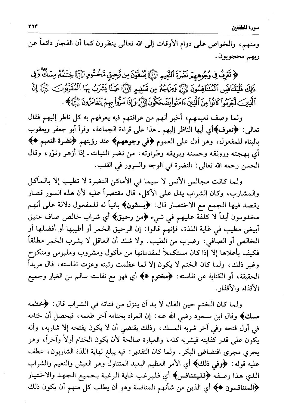 ) تَعْرِفُ فِي وُجُوهِهِمْ نَضْرَةَ النَّعِيمِ يُسْقَوْنَ مِن رَّحِيقٍ مَّخْتُومٍ خِتَامُهُ مِسْكٌ وَفِي ذَلِكَ فَلْيَتَنَافَسِ الْمُتَنَافِسُونَ وَمِزَاجُهُ مِن تَسْنِيمٍ عَيْناً يَشْرَبُ بِهَا الْمُقَرَّبُونَ إِنَّ الَّذِينَ أَجْرَمُواْ كَانُواْ مِنَ الَّذِينَ آمَنُواْ يَضْحَكُونَ وَإِذَا مَرُّواْ بِهِمْ يَتَغَامَزُونَ ( ( )