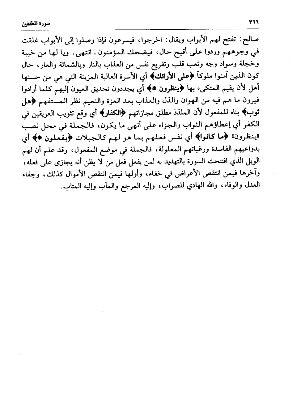 ويا لها من خيبة وخجلة وسواد وجه وتعب قلب وتقريع نفس من العذاب بالنار وبالشماتة والعار ، حال كون الذين آمنوا ملوكاً ) على الأرئك ) أي الأسرة العالية المزينة التي هي من حسنها أهل لأن يقيم المتكئ بها ) ينظرون ) أي يجددون تحديق العيون إليهم كلما أرادوا فيرون ما هم فيه من الهوان والذل والعذاب بعد العزة والنعيم نظر المستفهم ) هل ثوب ( بناه للمفعول لأن الملذذ مطلق مجازاتهم ) الكفار ) أي وقع تثويب العريقين في الكفر أي إعطاؤهم الثواب والجزاء على أنهى ما يكون ، فالجملة في محل نصب ( ينظرون ) ) ما كانوا ) أي نفس فعلهم بما هو لهم كالجبلات ) يفعلون ) أي بدواعيهم الفاسدة ورغباتهم المعلولة ، فالجملة في موضع المفعول ، وقد علم أن لهم الويل الذي افتتحت السورة بالتهديد به لمن يفعل فعل من لا يظن أنه يجازى على فعله ، وآخرها فيمن انتقص الأعرض في خفاء ، وأولها فيمن انتقص الأموال كذلك ، وجفاء العدل والوفاء ، والله الهادي للصواب ، وإليه المرجع والمآب وإليه المتاب .