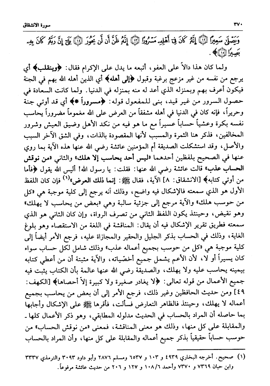 [ الانشقاق : 8 ] فقال : ( صلى الله عليه وسلم ) : ( إنما ذلك العرض ) فإن كان اللفظ الأول هو الذي سمعته فالإشكال فيه واضح ، وذلك أنه يرجع إلى كلية موجبة هي ( كل من حوسب هلك ) والآية مرجع إلى جزئية سالبة وهي ( بعض من يحاسب لا يهلك ) وهو نقيض ، وحينئذ يكون اللفظ الثاني من تصرف الرواة ، وإن كان الثاني هو الذي سمعته فطريق تقدير الإشكار فيه أن يقال : المناقشة في اللغة من الاستقصاء وهو بلوغ الغاية ، وذلك في الحساب بذكر الجليل والحقير والمجازاة عليه ، فرجع الأمر أيضاً إلى كلية موجبة هي ( كل من حوسب بجميع أعماله عذب ) وذلك شامل لكل حساب سواء كان يسيراً أو لا ، لأن الأعم يشمل جميع أخصّاته ، والآية مثبتة أن من أعطي كتابه بيمينه يحاسب عليه ولا يهلك ، والصديقة رضي الله عنها عالمة بأن الكتاب يثبت فيه جميع الأعمال من قوله تعالى :