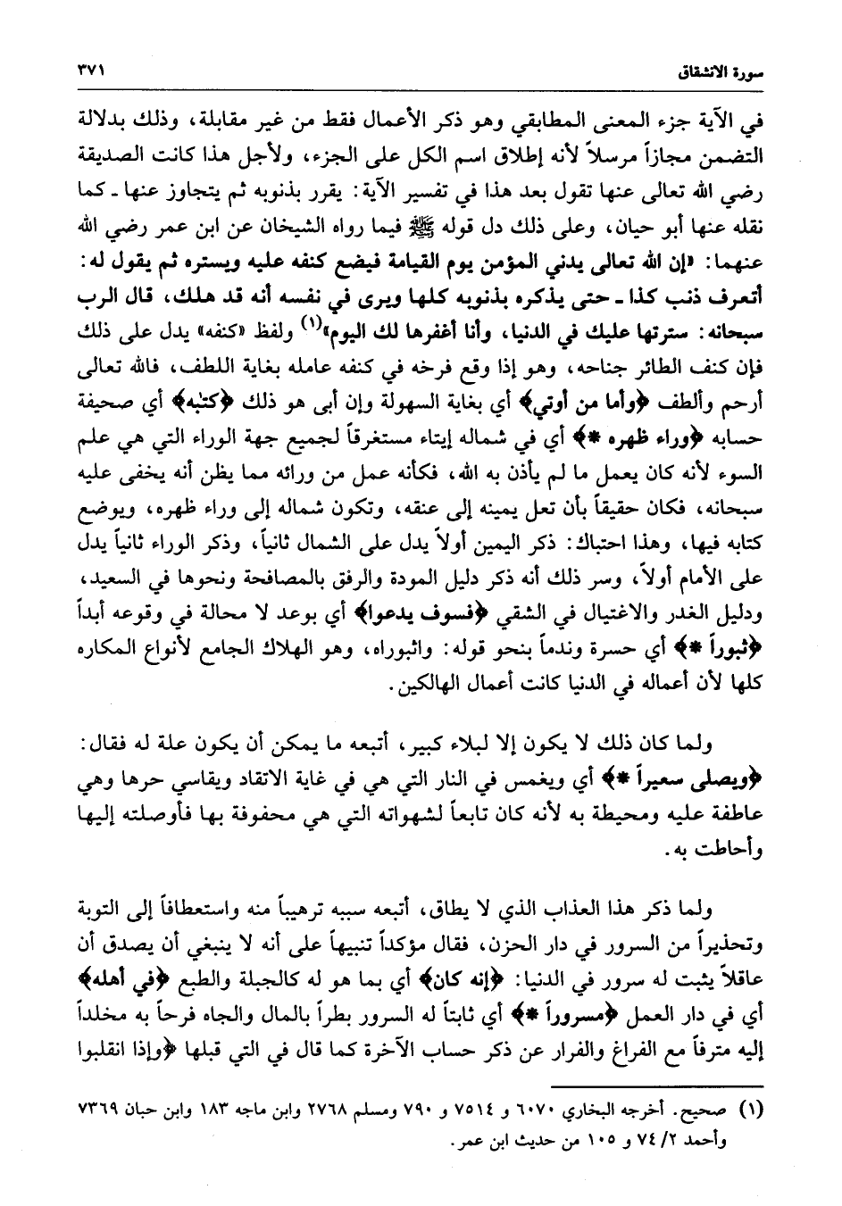 في الآية جزء المعنى المطابقي وهو ذكر الأعمال فقط من غير مقابلة ، وذلك بدلالة التضمن مجازواً مرسلاً لأنه إطلاق اسم الكل على الجزء ، ولأجل هذا كانت الصديقة رضي الله تعالى عنها تقول بعد هذا في تفسير الآية : يقرر بذنوبه ثم يتجاوز عنها - كما نقله عنها أبو حيان ، وعلى ذلك دل قوله ( صلى الله عليه وسلم ) فيما رواه الشيخان عن ابن عمر رضي الله عنهما : ( إن الله تعالى يدنى المؤمن يوم القيامة فيضع كنفه عليه ويستره ثم يقول له : أتعرف ذنب كذا - حتى يذكره بذنوبه كلها ويرى في نفسه أنه قد هلك ، قال الرب سبحانه : سترتها عليك في الدنيا ، وأنا إغفرها لك اليوم ) ولفظ ( كنفه ) يدل على ذلك فإن كنفه الطائر جناحه ، وهو إذا وقع فرخه في كنفه عامله بغاية اللطف ، فالله تعالى أرحم وألطف ) وأما من أوتي ) أي بغاية السهولة وإن أبى هو ذلك ) كتابه ) أي صحيفة حسابه ) وراء ظهره ) أي في شماله إيتاء مستغرقاً لجميع جهة الوراء التي هي علم السوء لأنه كان يعمل ما لم يأذن به الله ، فكأنه عمل من ورائه مما يظن أنه يخفى عليه سبحانه ، فكان حقيقاً بأن تعل يمينه إلى عنقه ، وتكون شماله إلى وراء ظهره ، ويوضع على الأمام أولاً ، وسر ذلك أنه ذكر دليل المودة والرفق بالمصافحة ونحوها في السعيد ، ودليل الغدر والاغتيال في الشقي ) فسوف يدعوا ) أي بوعد لا محالة في وقوعه أبداً ) ثبوراً ) أي حسرة وندماً بنحو قوله : واثبوراه ، وهو الهلاك الجامع لأنواع المكاره كلها لأن أعماله في الدنيا كانت أعمال الهالكين .