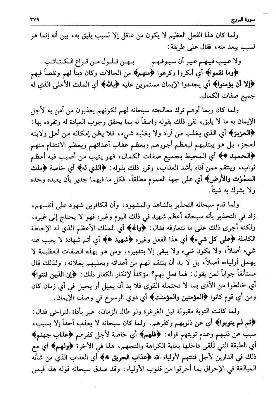 ولما قدم سبحانه التحذير بالشاهد والمشهود ، وأن الكافرين شهود على أنفسهم ، زاد في التحذير بأنه سبحانه أعظم شهيد في ذلك اليوم وغيره فهو لا يحتاج إلى غيره ، ولكنه أجرى ذلك على ما نتعارفه فقال : ( والله ) أي الملك الأعظم الي له الإحاطة الكاملة ) على كل شيء ) أي هذا الفعل وغيره ) شهيد ) أي أتم شهادة لا يغيب عنه شيء أصلاً ، ولا يكون شيء ولا يبقى إلا بتدبيره ، ومن هو بهذه الصفات العظيمة لا يهمل أولياءه أصلاً ، بل لا بد ان ينتقم لهم من أعدائه ويعليهم بعلائه ، ولذلك قال مستأنفاً جواباً لمن يقول : فما فعل بهم ؟ مؤكداً لإنكار الكفار ذلك : ( إن الذين فتنوا ) أي خالطوا من الأذى بما لا تحتمله القوى فلا بد أن يميل أو يحيل في أي زمان كان ومن أي قوم كانوا ) المؤمنين والمؤمنات ) أي ذوي الرسوخ في وصف الإيمان .