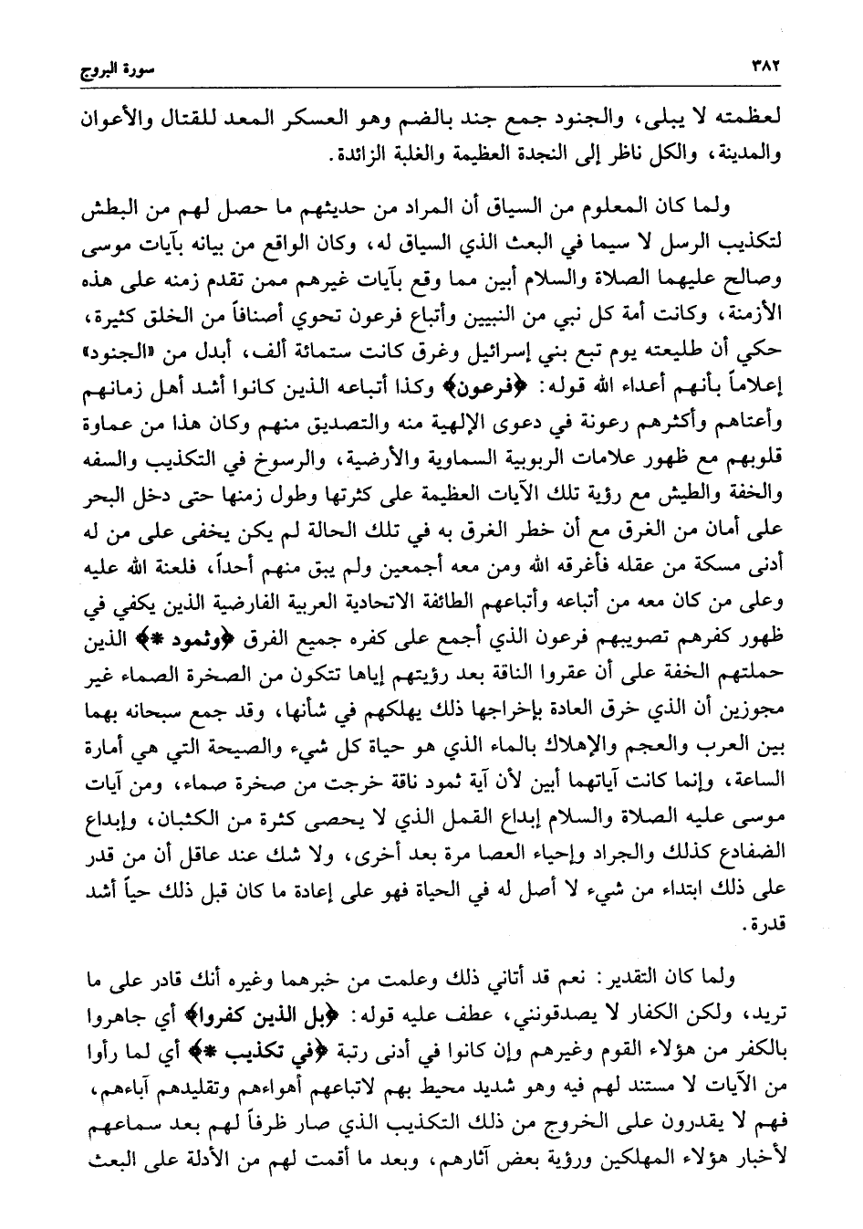 ولما كان المعلوم من السياق أن المراد من حديثهم ما حصل لهم من البطش لتكذيب الرسل لا يسما في البعث الذي السياق له ، وكان الواقع من بيانه بآيات موسى وصالح عليهما الصلاة والسلام أبين مما وقع بآيات غيرهم ممن تقدم من الخلق كثيرة ، حكي أن طليعته يوم تبع بني إسرائيل وغرق كانت ستمائة ألف ، أبدل من ( الجنود ) إعلاماً بأنهم أعداء الله قوله : ( فرعون ( وكذا أتباعه الذين كانوا أشد أهل زمانهم وأعتاهم وأكثرهم رعونة في دعوى الإلهية منه والتصديق منهم وكان هذا من عمارة قلوبهم مع ظهور علامات الربوبية السماوية والأرضية ، والرسوخ في التكذيب والسفه والخفة والطيش مع رؤية تلك الآيات العظيمة على كثرتها وطول زمنها حتى دخل الحبر على أمان من الغرق مع أن خطر الغرق به في تلك الحالة لم يكن يخفى على من له أدنى مسكة من عقله فأغرقه وأتباعهم الطائفة الاتحادية العربية الفارضية الذين يكفي في ظهور كفرهم تصويبهم فرعون الذي أجمع على كفره جميع الفرق ) وثمود ( الذين حملتهم الخفة على أن عقروا الناقة بعد رؤيتهم إياها تتكون من الصخرة الصماء غير مجوزين أن الذي خرق العادة بإخراجها ذلك يهلكهم في شأنها ، وقد جمع سبحانه بهما الساعة ، وإنما كانت آياتهما أبين لأن آية ثمود ناقة خرجت من صخرة صماء ، ومن آيات موسى عليه الصلاة والسلام إبداع القمل الذي لا يحصى كثرة من الكثبان ، وإبداع الضفادع كذلك والجراد وإحياء العصا مرة أخرى ، ولا شك عند عاقل أن من قدر على ذلك ابتداء من شيء لا أصل في الحاية فهو على إعادة ما كان قبل ذلك حياً أشد قدرة .