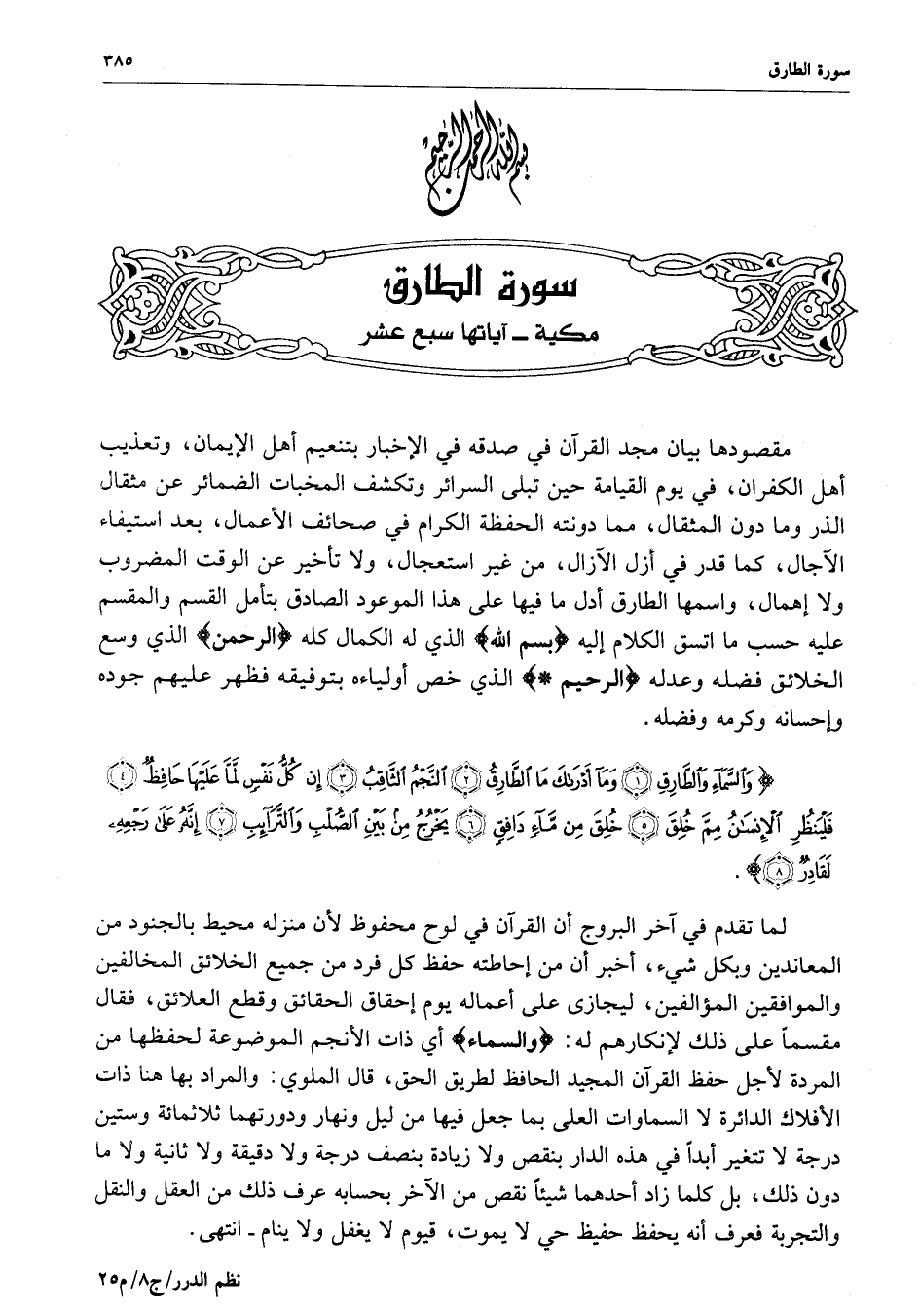 ) وَالسَّمَآءِ وَالطَّارِقِ وَمَآ أَدْرَاكَ مَا الطَّارِقُ النَّجْمُ الثَّاقِبُ إِن كُلُّ نَفْسٍ لَّمَّا عَلَيْهَا حَافِظٌ فَلْيَنظُرِ الإِنسَانُ مِمَّ خُلِقَ خُلِقَ مِن مَّآءٍ دَافِقٍ يَخْرُجُ مِن بَيْنِ الصُّلْبِ وَالتَّرَآئِبِ إِنَّهُ عَلَى رَجْعِهِ لَقَادِرٌ ( ( )
