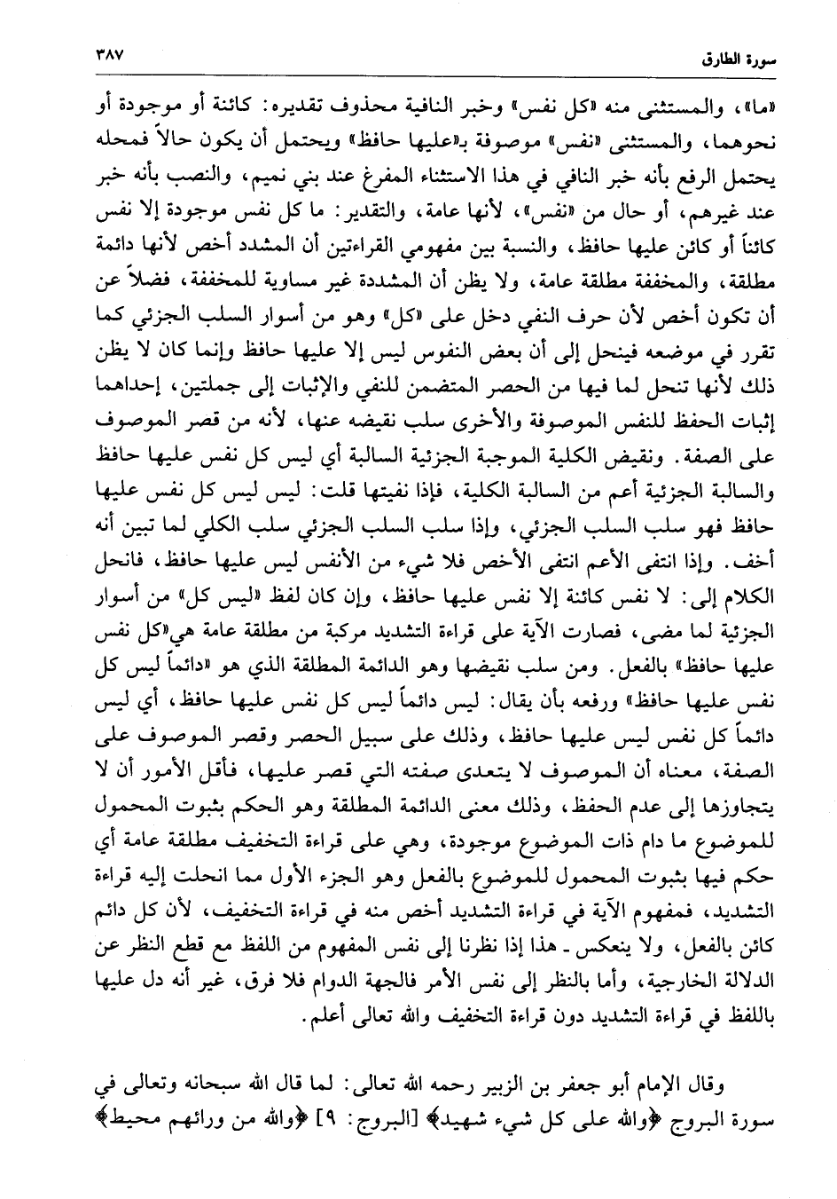 ( ما ) ، والمستثنى منه ( كل نفس ) وخبر النافية محذوف تقديره : كائنة أو موجودة أو نحوهما ، والمستثنى ( نفس ) موصوفة ب ( عليها حافظ ) ويحتمل أن يكون حالاً فمحله يحتمل الرفع بأنه خبر النافي في هذا الاسثناء المفرغ عند بني نميم ، والنصب بأنه خبر عند غيرهم ، أو حال من ( نفس ) ، لأنها عامة ، والتقدير : ما كل نفس موجودة إلى نفس كائناً أو كائن عليها حافظ ، والنسبة بين مفهومي القراءتين أن المشدد أخص لأنها دائمة مطلقة ، والمخففة مطلقة عامة ، ولا يظن أن المشددة غير مساوية للمخففة ، فضلاً أن تكون أخص لأن حرف النفي دخل على ( كل ) وهو من أسوار السلب الجزئي كما تقرر في موضعه فينحل إلى أن بعض النفوس ليس إلا عليها حافظ وإنما كان لا يظن ذلك لأنها تنحل لما فيها من الحصر المتضمن للنفي والإثبات إلى جملتين ، إحداهما إثبات الحفظ للنفس الموصوفة والأخرى الجزئية السالبة أي ليس كل نفس عليها حافظ والسالبة الجزئية أعم من السالبة الكلية ، فإذا نفيتها قلت : ليس ليس كل نفس عليها حافظ فهو سلب السلب الجزئي ، وإذا سلب السلب الجزئي سلب الكلي لما تبين أنه أخف .