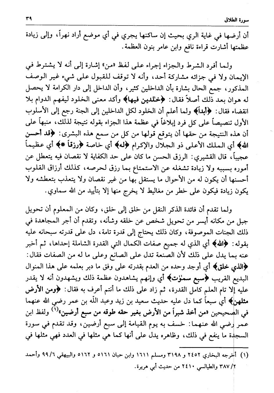 ولم تقدم أن فائدة الذكر النقل من خلق إلى خلق ، وكان من المعلوم أن تحويل جبل من مكانه أيسر من تحيل شخص عن خلقه وشأنه ، وتقدم أن أجر المجاهد في ذلك الجنات الموصوفة ، وكان ذلك يحتاج إلى قدرة تامة ، دل على قدرته سبحانه عليه بقوله : ( الله ) أي الذي له جميع صفات الكمال التي القدرة الشاملة إحدها ، ثم أخبر عنه بما يدل على ذلك لأن الصنعة تدل على الصانع وعلى ما له من الصفات فقال : ( الذي خلق ) أي أوجد وحده من العدم بقدرته على وفق ما دبر بعلمه على هذا المنوال البديع القريب ) سبع سماوات ) أي وإنهم يشهاهدون عظمة ذلك ويشهدون أنه لا يقدر عليه إلا تام العلم كامل القدرة ، ثم زاد على ذلك ما أنتم أعرف به فقال : ( ومن الأرض مثلهن ) أي سبعاً كما دل عليه حديث سعيد بن زيد وعبد الله بن عمر رضي الله عنهما في الصحيحين ( من أخذ شبراً من الأرض بغير حقه طوقه من سبع أرضين ) ولفظ ابن عمر رضي الله عنهما : خسف به يوم القيامة إلى سبع أرضين ، وقد تقدم في سورة السجدة ما ينفع في ذلك ، وظاهره يدل على أنها كما هي مثلها في العدد فهي مثلها في