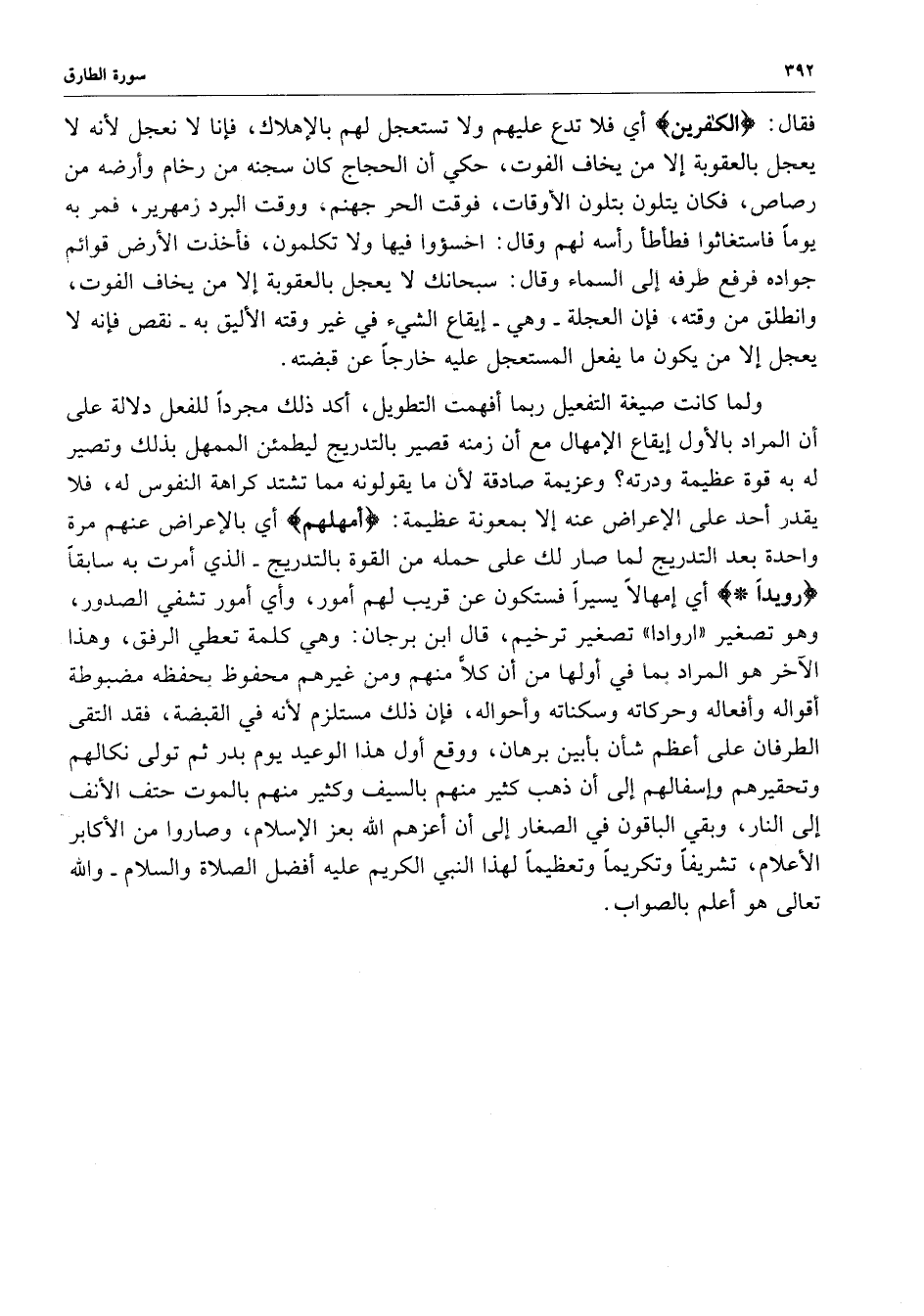 ولما كانت صيغة التفعيل ربما أفهمت التطويل ، أكد ذلك مجرداً للفعل دلالة على أن المراد بالأول إيقاع الإمهال مع ان زمنه قصير بالتدريج ليطمئن الممهل بذلك وتصر له به قوة عظيمة ودرته ؟ وعزيمة صادقة لأن ما يقولونه مما تشتد كراهة النفوس له ، فلا يقدر أحد على الإعراض عنه إلا بمعونة عظيمة : ( أمهلهم ) أي بالإعراض عنهم مرة واحدة بعد التدريج لما صار لك على حمله من القوة بالتدريج - الذي أمرت به سابقاً ) رويداً ) أي إمهالاً يسيراً فستكون عن قريب لهم أمور ، وأي أمور تشفي الصدور ، وهو تصغير ( ارادوا ) تصغير ترخيم ، قال ابن برجان : وهي كلمة تعطي الرفق ، وهذا الآخر هو المراد بما في أولها من أن كلاًّ منهم ومن غيرهم محفوظ بحفظه مضبوطة أقواله وأفعاله وحركاته وسكناته وأحواله ، فإن ذلك مستلزم لأنه في القبضة ، فقد التقي الطرفان على أعظم شأن بأبين برهان ، ووقع أول هذا الوعيد يوم بدر ثم تولى نكالهم وتحقيرهم وإسفالهم إلى أن ذهب كثير منهم بالسيف وكثر منهم بالموت حتف الأنف إلى النار ، وبقي الباقون في الصغار إلى أن أعزهم الله بعز الإسلام ، وصاروا من الأكابر الأعلام ، تشريفاً وتكريماً وتعظيماً لهذا النبي الكريم عليه أفضل الصلاة والسلام ، والله تعالى هو أعلم بالصواب .