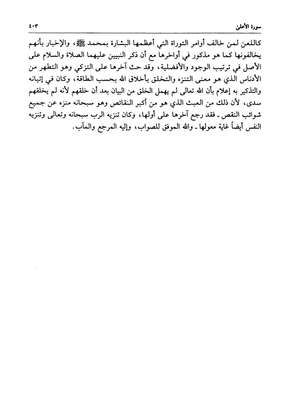 كاللعن لمن خالف أومر التوراة التي أعظمها البشارة بمحمد ( صلى الله عليه وسلم ) ، والإخبار بأنهم يخالفونها كما هو مذكور في أواخرها مع أن ذكر النبيين عليهما الصلاة والسلام على الأصل في ترتيب الوجود والأفضلية ، وقد حث آخرها على التزكي وهوالتطهر من الأدناس الذي هو معنى التنهزه والتخلق بأخلاق الله بحسب الطاقة ، وكان في إتيانه والتذكير به إعلام بأن الله تعالى لم يهمل الخلق من البيان بعد أن خلقهم لأنه لم يخلقهم سدى ، لأن ذلك من العبث الذي هو من أكبر النقائص وهو سبحانه منزه عن جميع شوائب النقص - فقد رجع آخرها على أولها ، وكان تنزيه الرب سبحانه وتعالى وتنزيه النفس أيضاً غاية معولها - والله الموفق للصواب ، وإليه المرجع والمآب .