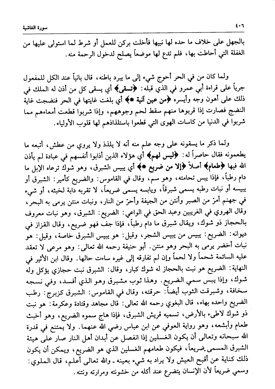 ولا يمتنع في قدرة الله سبحانه وتعالى أن يكون الغسلين إذا انفصل عن أبدان أهل النار صار على هيسة الشبرق المسمى ضريعاً ، فيكون طعامهم الغسلين الذي هو الضريع ، ويمكن أن يكون ذلك كناية عن أقبح العيش ولا يراد به شيء بعينه - والله تعالى أعلم ، قال الملوي : وسمي ضريعاً لأن الإنسان يتضرع عند أكله من خشونته ومرارته ونتنه .