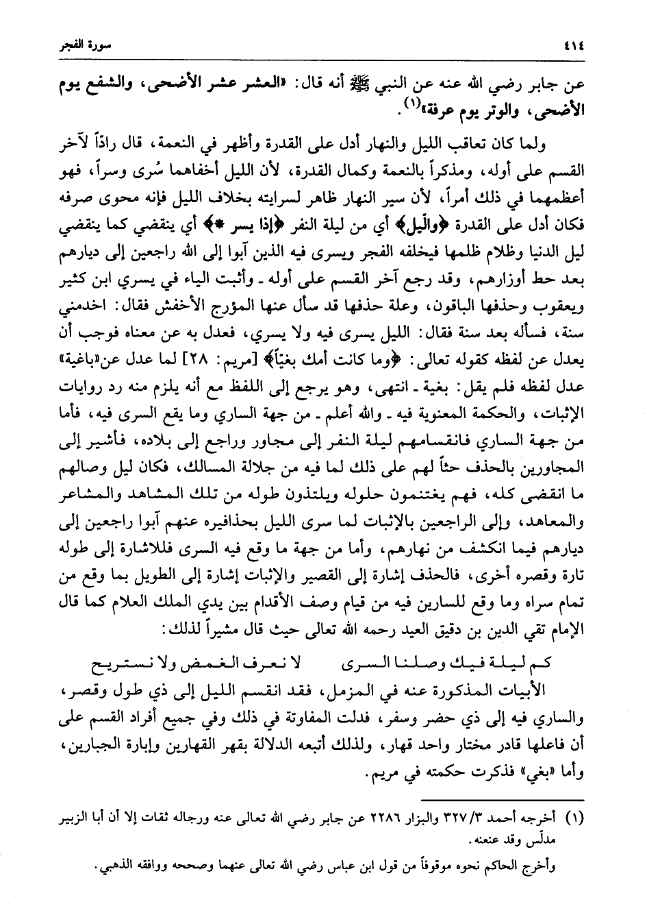 عن جابر رضي الله عنه عن النبي ( صلى الله عليه وسلم ) أنه قال : ( العشر الأضحى ، والشفع يوم الأضحى ، والوتر يوم عرفة ) .